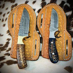 New custom made Damascus steel two Cowboy skinner knives set.with two leather sheaths