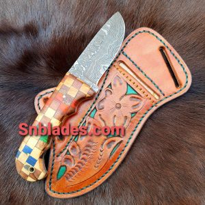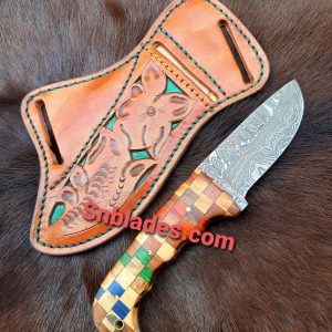 Custom Made Damascus Steel Western Cowboy Skinner knife with Leather Sheath