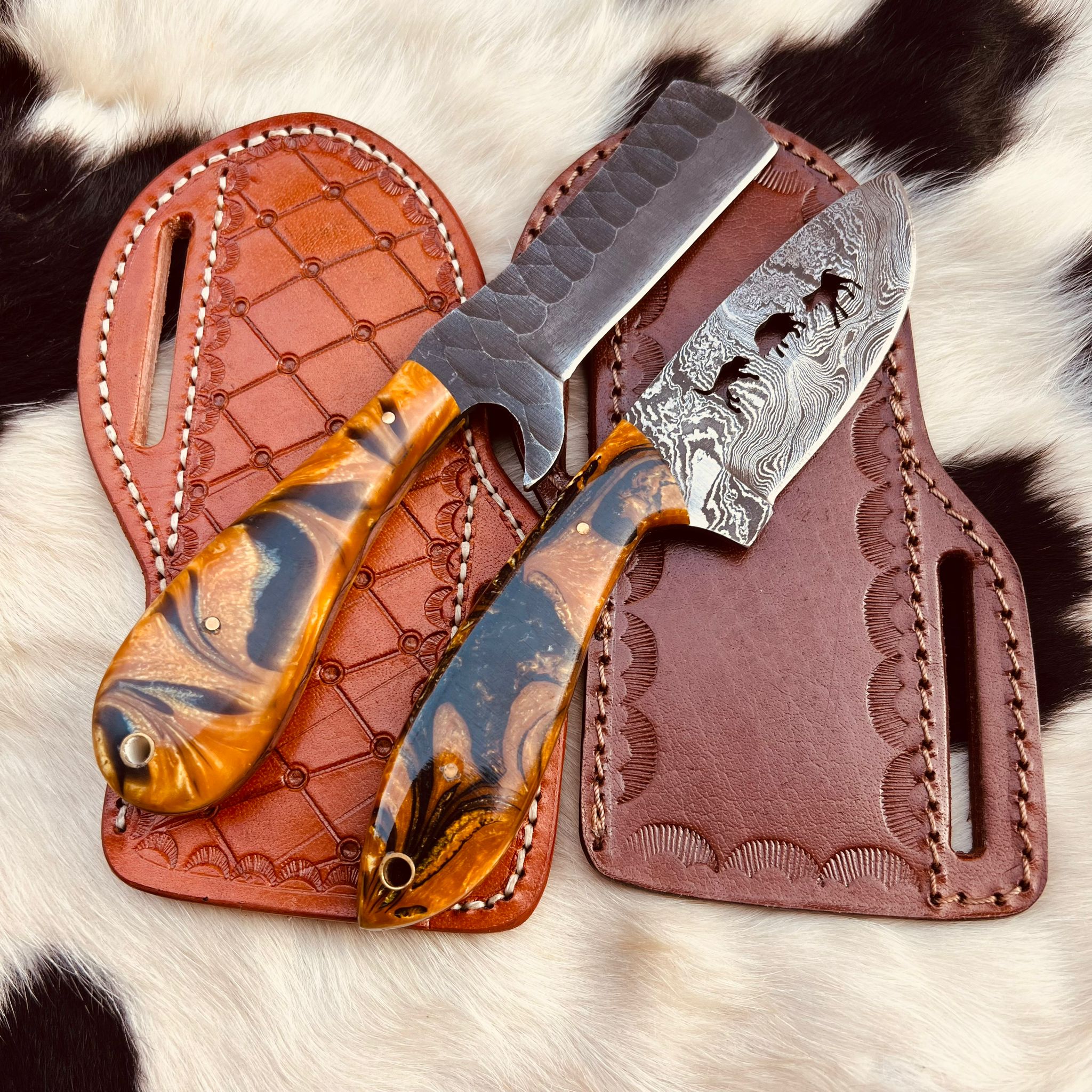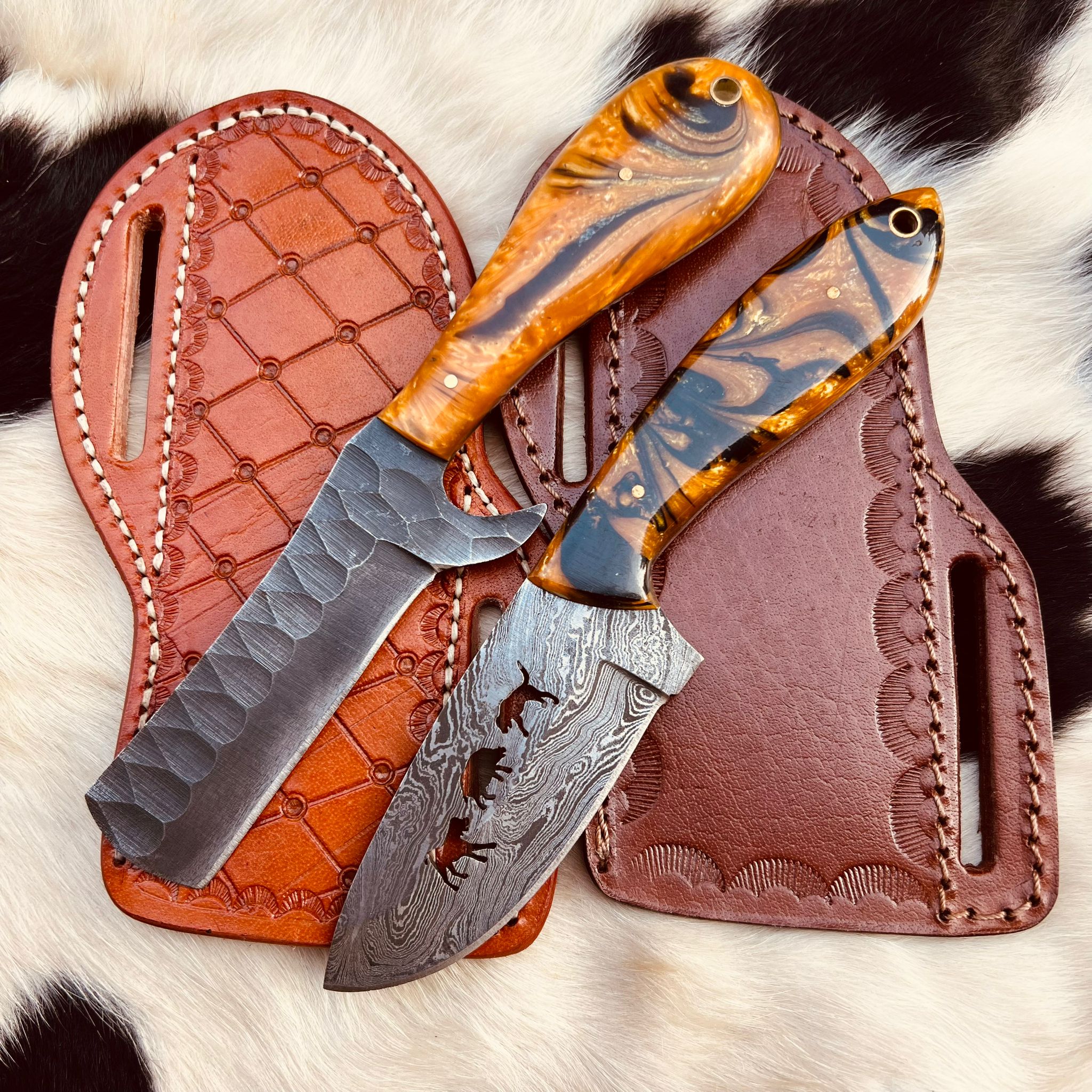 Custom Made 1095 and Damascus Steel Full Tang Blade Two Cowboy Bull cutter and Skinner knife set…
