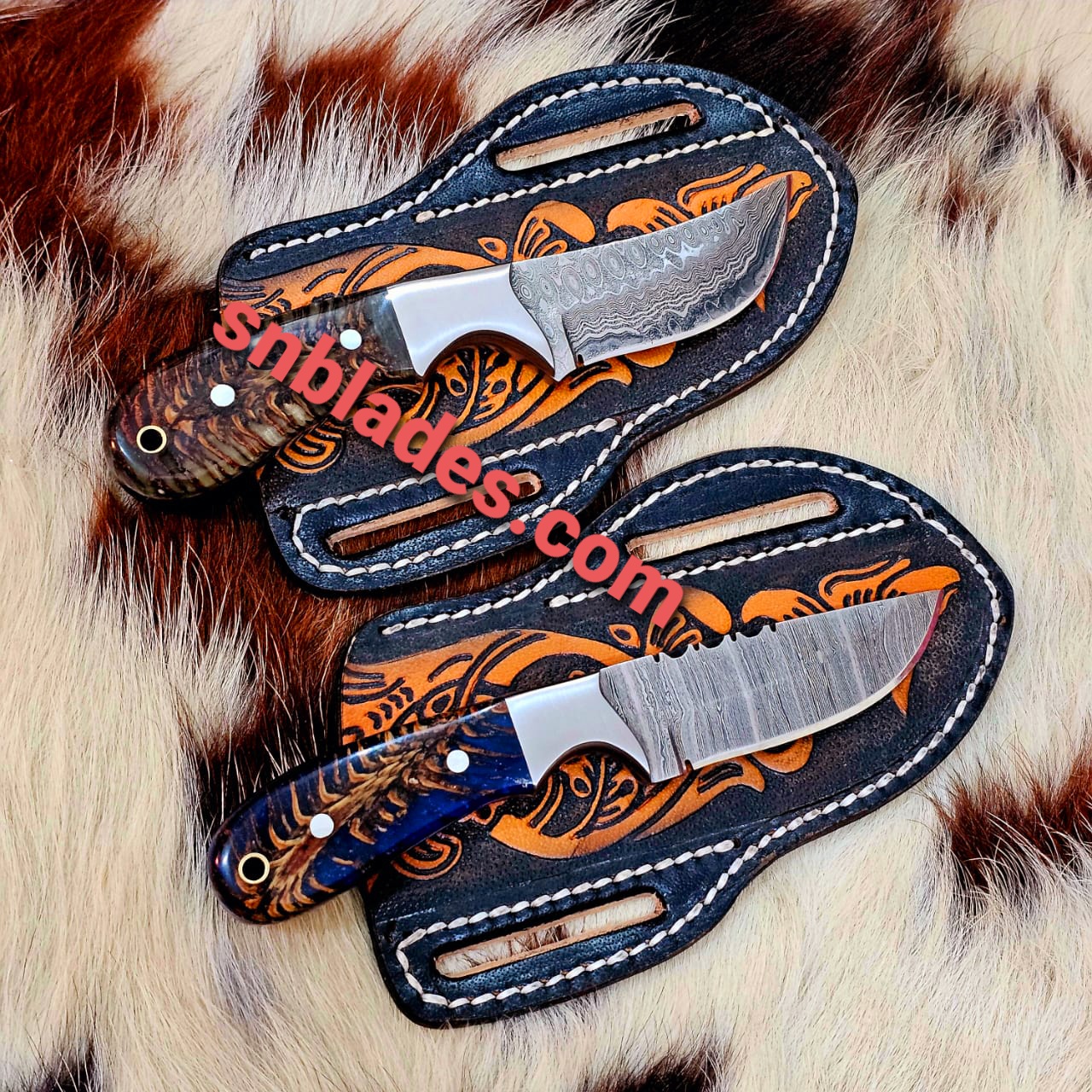 The knives made Damascus Steel Two Cowboy Skinner knives set overall length 8″inch Handle made of Pine Coon Resin Comfortable handle grip Comes with Two Leather Sheaths.