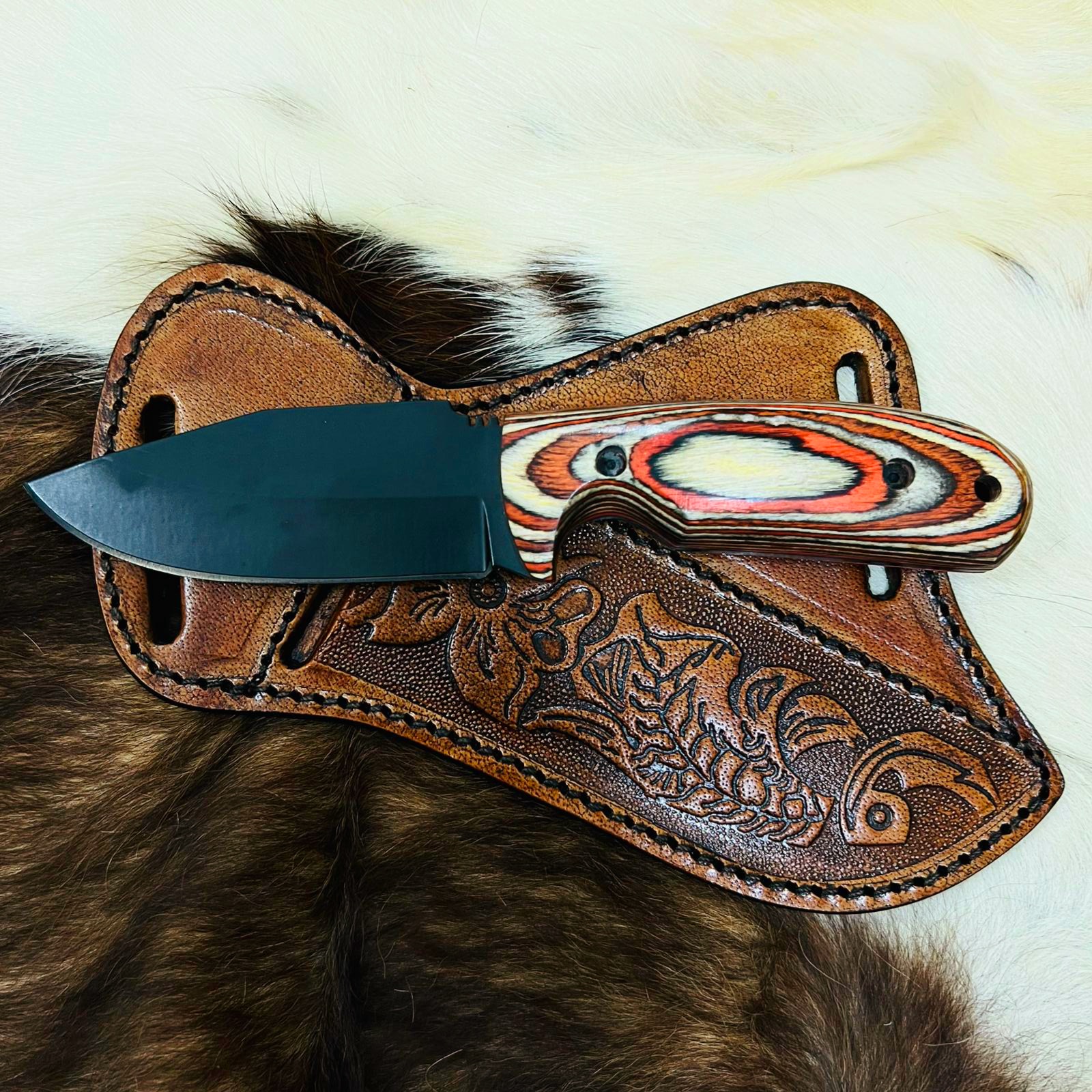 Handmade 1095 steel skinner knife overall length 8″inches handle made of macrita wood hold edge and comfortable handle comes with leather sheath..