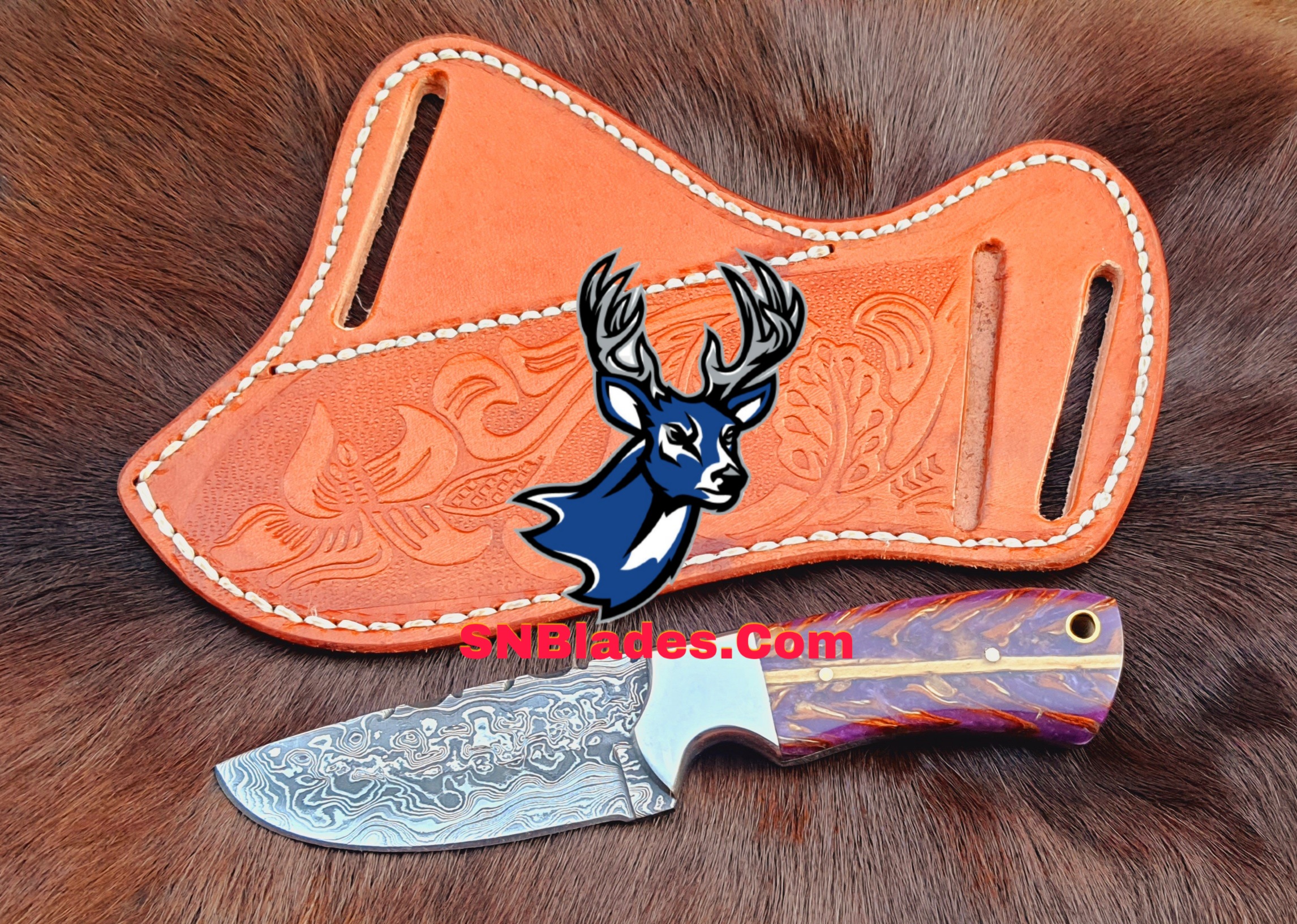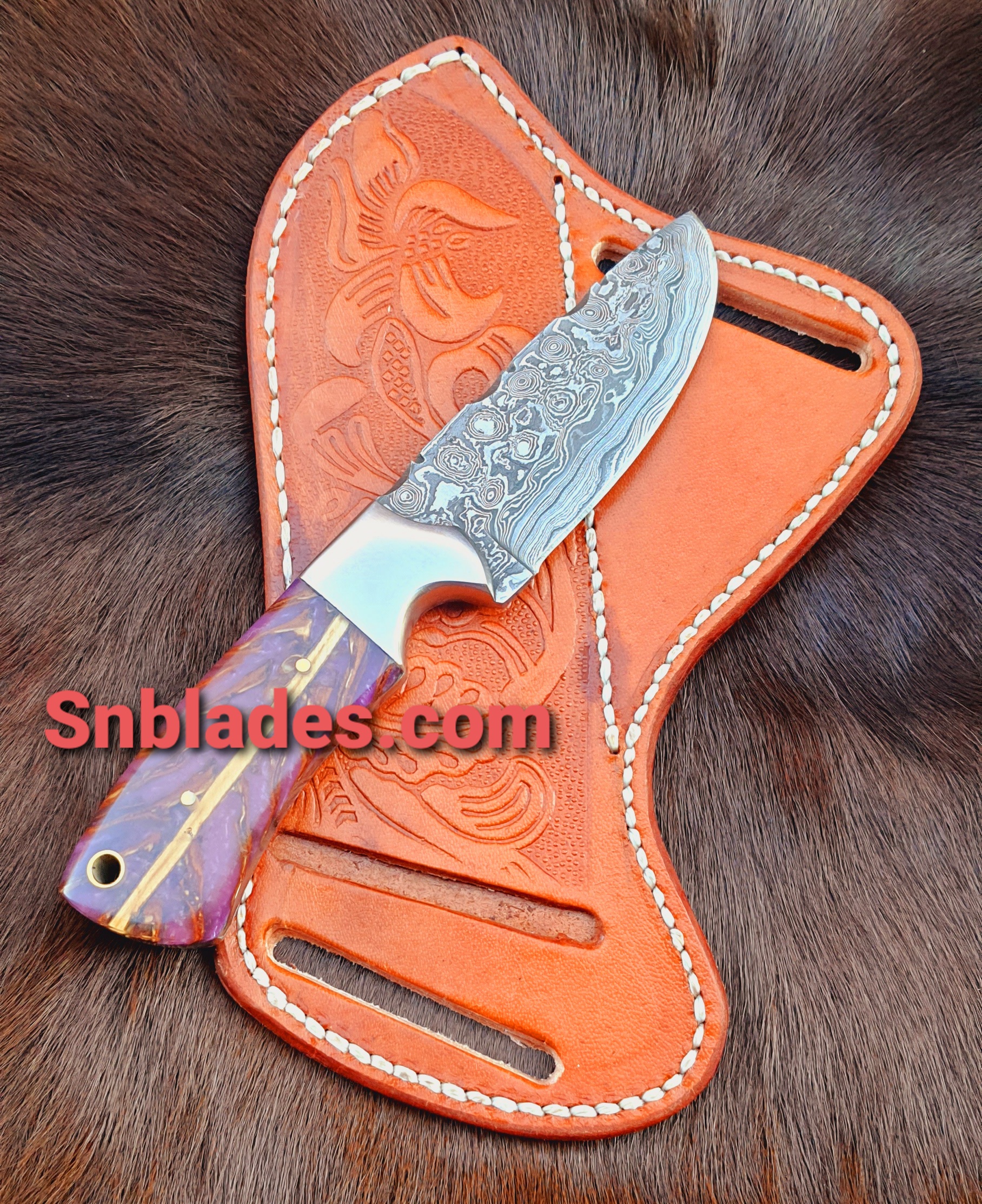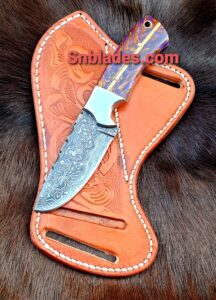 Handmade Damascus steel cowboy skinner knife overall length 7″inch handle made of pine cone hold edge and comfortable handle comes with leather sheath.