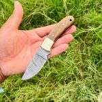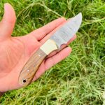 Custom Handmade Damascus steel skinner knife overall length 7″inches handle made of burl wood with brass bostter shrap edge and still long time comes with leather sheath…