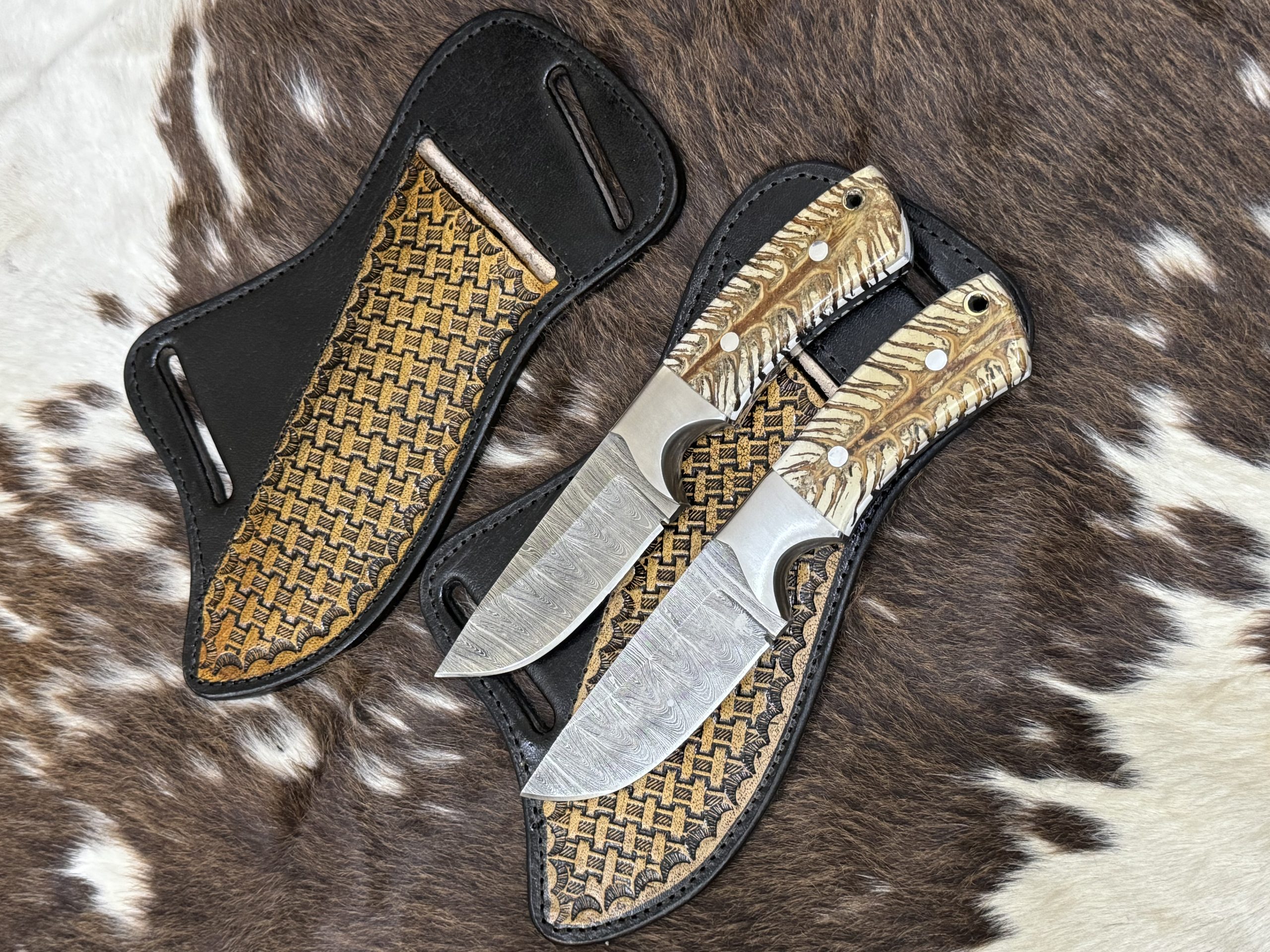 Custom handmade Damascus Steel Cowboy two Skinner knifes overall length 7”inches handle made of Pinecoon Shrap Edge and still long time comes with cross Darw Leather Sheaths…
