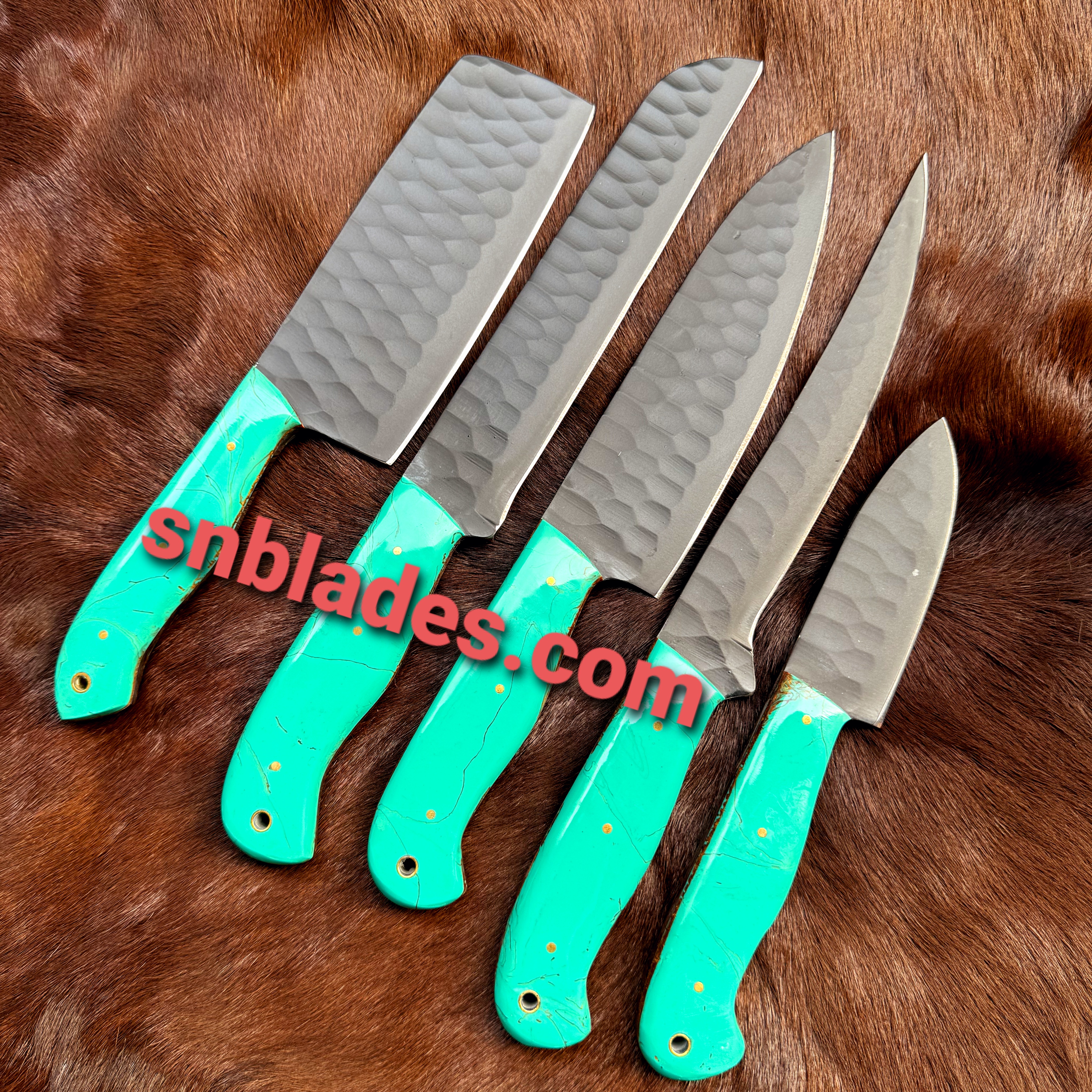 Custom made 1095 steel Kitchen knives set overall length 8″inch to 13″inch Handle made of Resin hold edges and comfortable handle comes with leather bag..