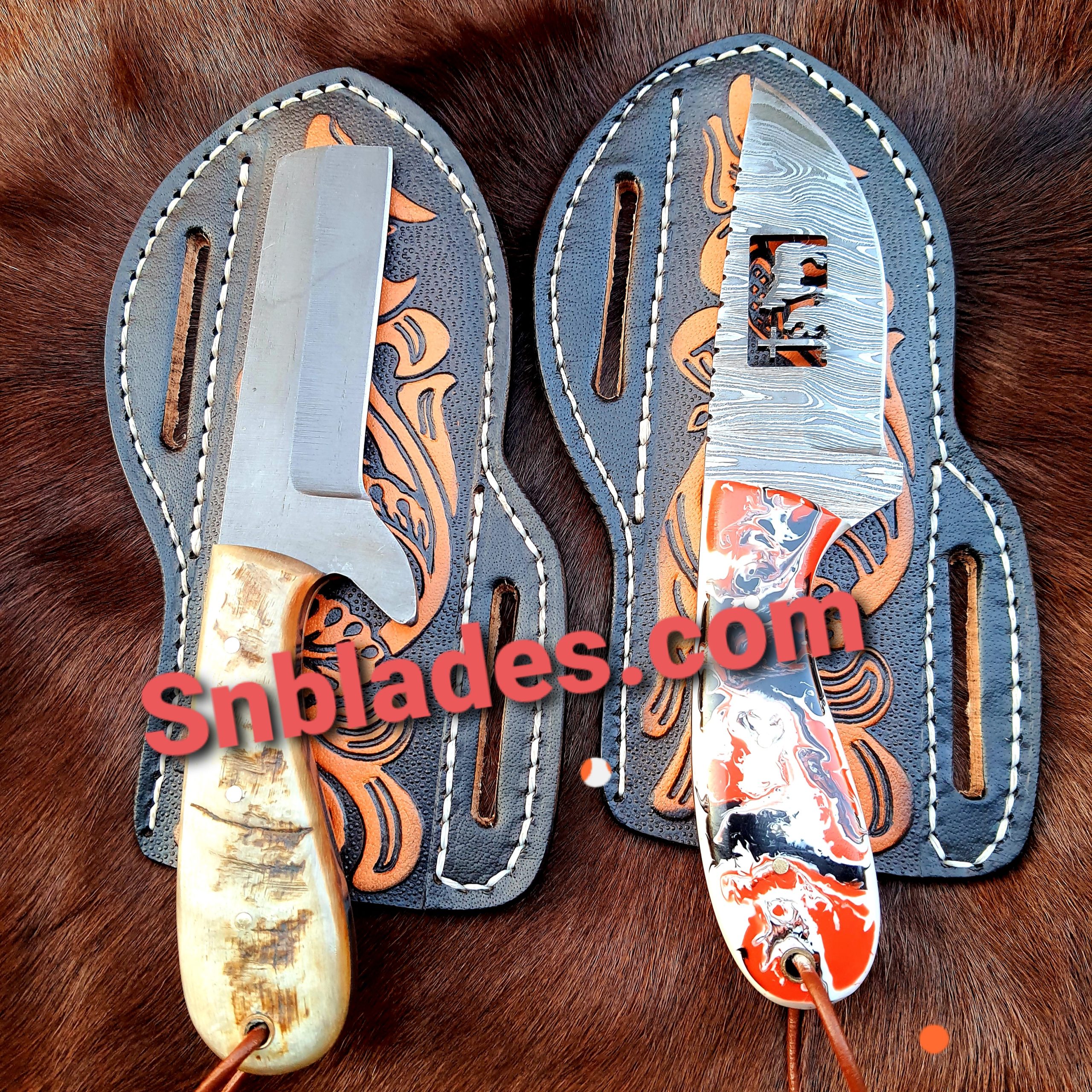 Custom handmade 1095 and Damascus steel cowboy & bull cutter knife. Overall lengths are 8 inches. Handles are made of resin and ram horn. Each knife comes with sheath . They holda good edge and stay sharp for long time.