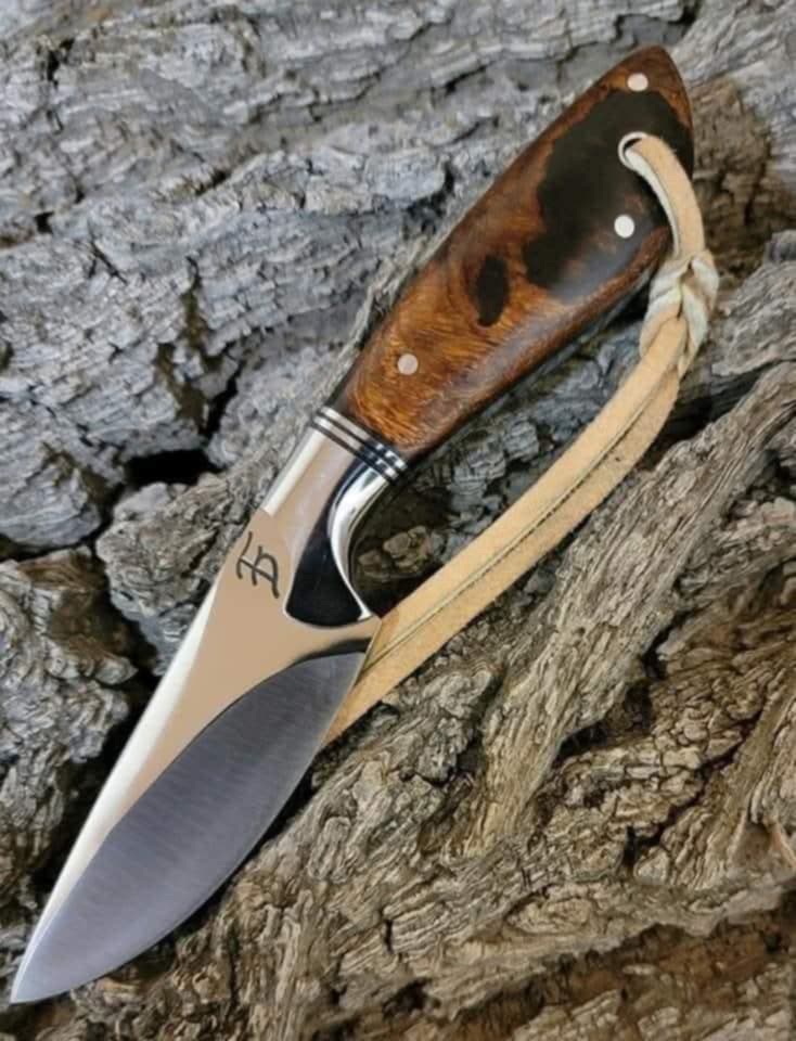 Custom made d2 steel Skinner knife overall length 8″inch blade size 4″inch Handle made of Rose wood Hold edges and comfortable Handle grip comes with leather sheath.