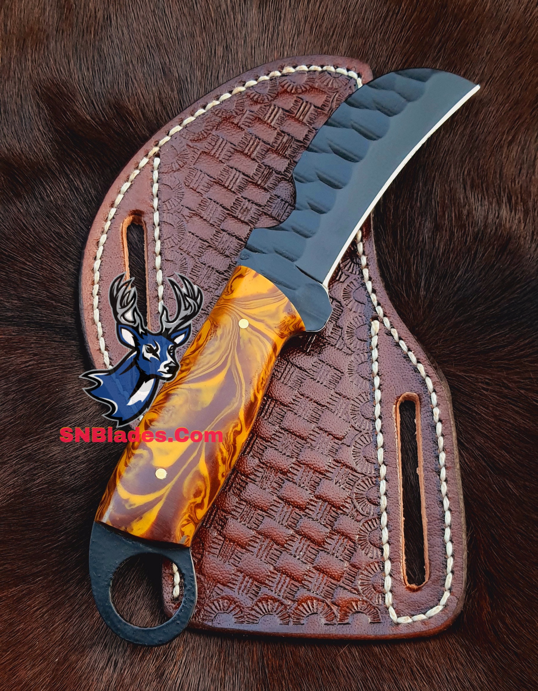 Handmade 1095 steel Hawksbill lineman skinner knife overall length 8″inch handle made of Resin hold edge and comfortable handle comes with leather sheath..