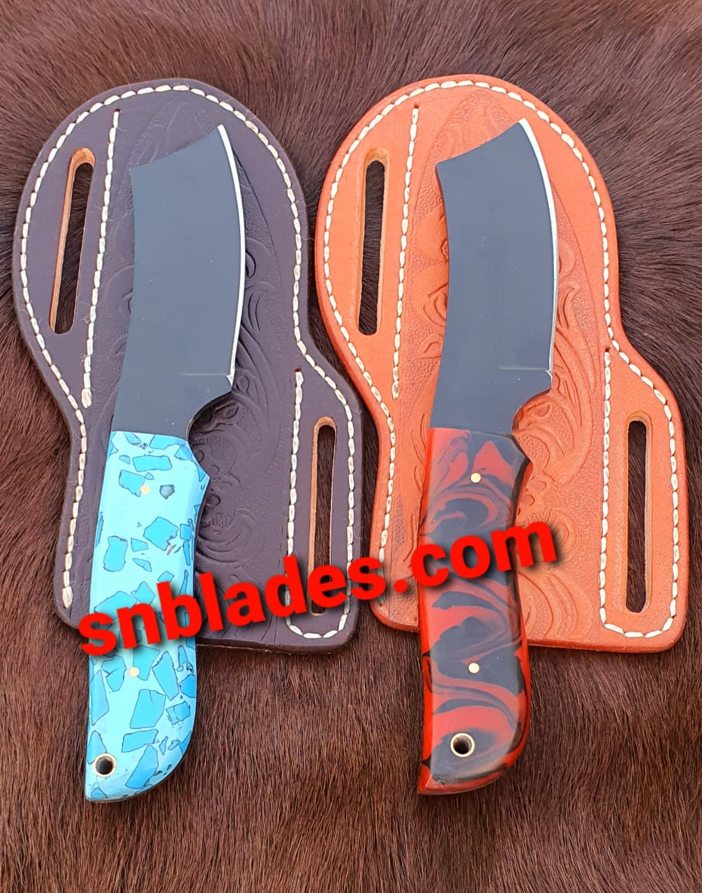 Two Hunting Knifes Our steel combination has taken years to perfect and has been testing under a variety of applications, which will offer professional performance in categories of toughness, strength (lateral stress) and edge honing and holding ability. Two Hunting Knifes in a 5 spot Rockwell test our blades will average near or close to 58 which offers a perfect balances between its toughness and strength.Our blades due to carbon content need to be regularly treated with wax and/or 3 in 1 oil to maintain its superior quality.