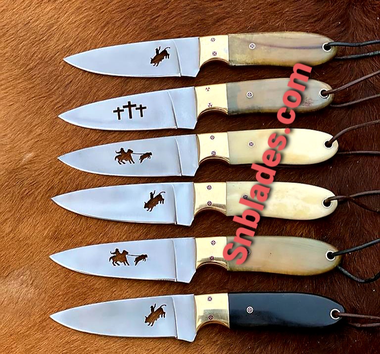 Handmade 1095 steel Six Cowboy Skinner knives set overall length 8″inch Handle made of Deer bone and Ram Horn and black Bufflo Harn Hold edge and comfortable handle comes with six leather sheaths.