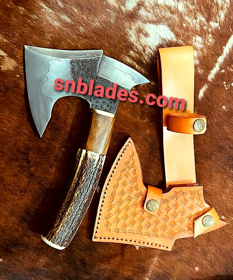 Handmade 1095 steel Axe overall length 12″inch handle made of burl wood and stage Horn hold edge and comfortable Handle comes with leather sheath.