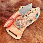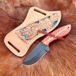 Handmade 1095 steel cowboy Skinner knife overall length 8″inch Handle made of Pine coon Hold edge and Comfortable Handle Grip Comes with Crass Darw Leather sheath.