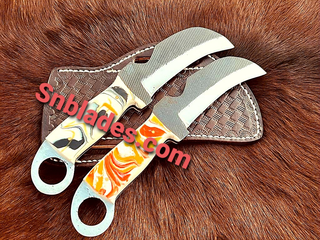 Handmade 1095 steel two Hawksbill lineman Skinner knives set overall length 8″inch Handle made of Resin hold edges and comfortable handle comes with two leather sheaths..