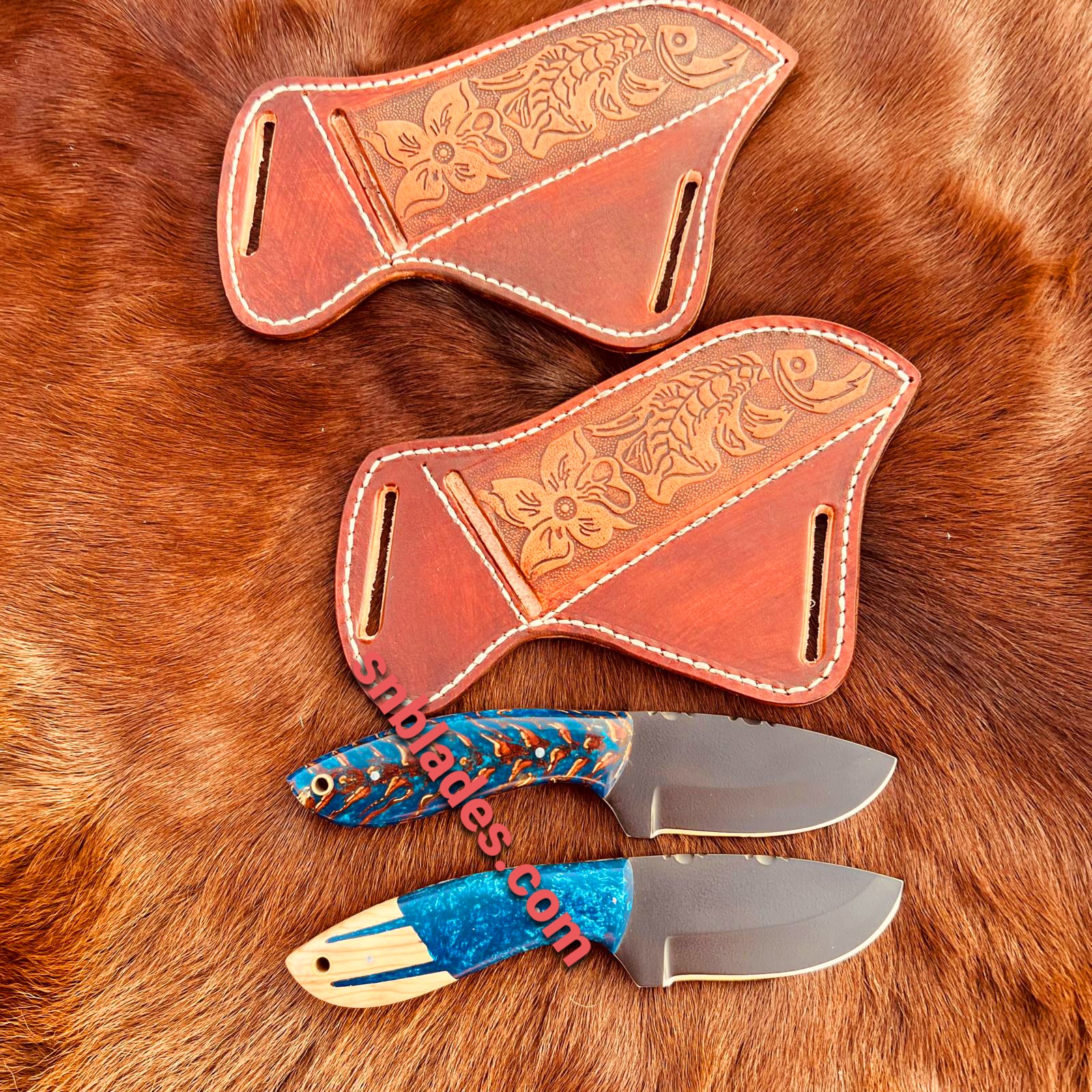 Handmade 1095 steel Two Hunting Skinner knifes overall length 8″inch Handle made of Pine coon and Resin and wood Hold edges and comfortable handle comes with leather sheaths..