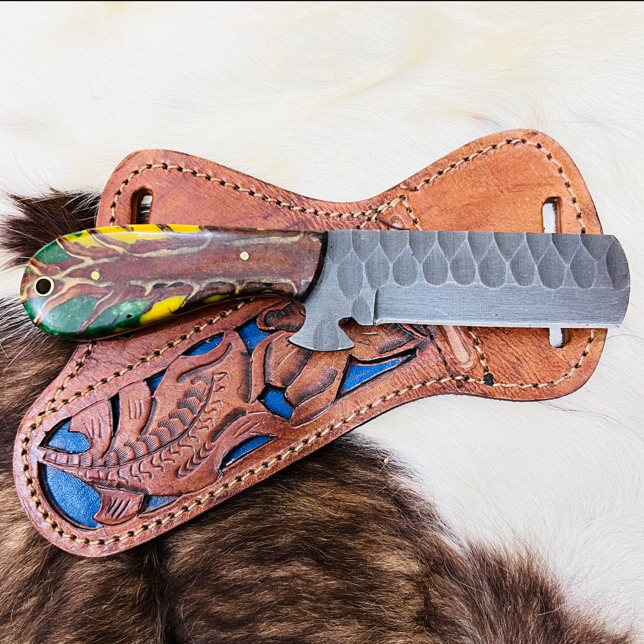Handmade 1098 steel cowboy bull cutter knife overall length 8″inches handle made of pine coon hold edge and comfortable handle comes with leather sheath.