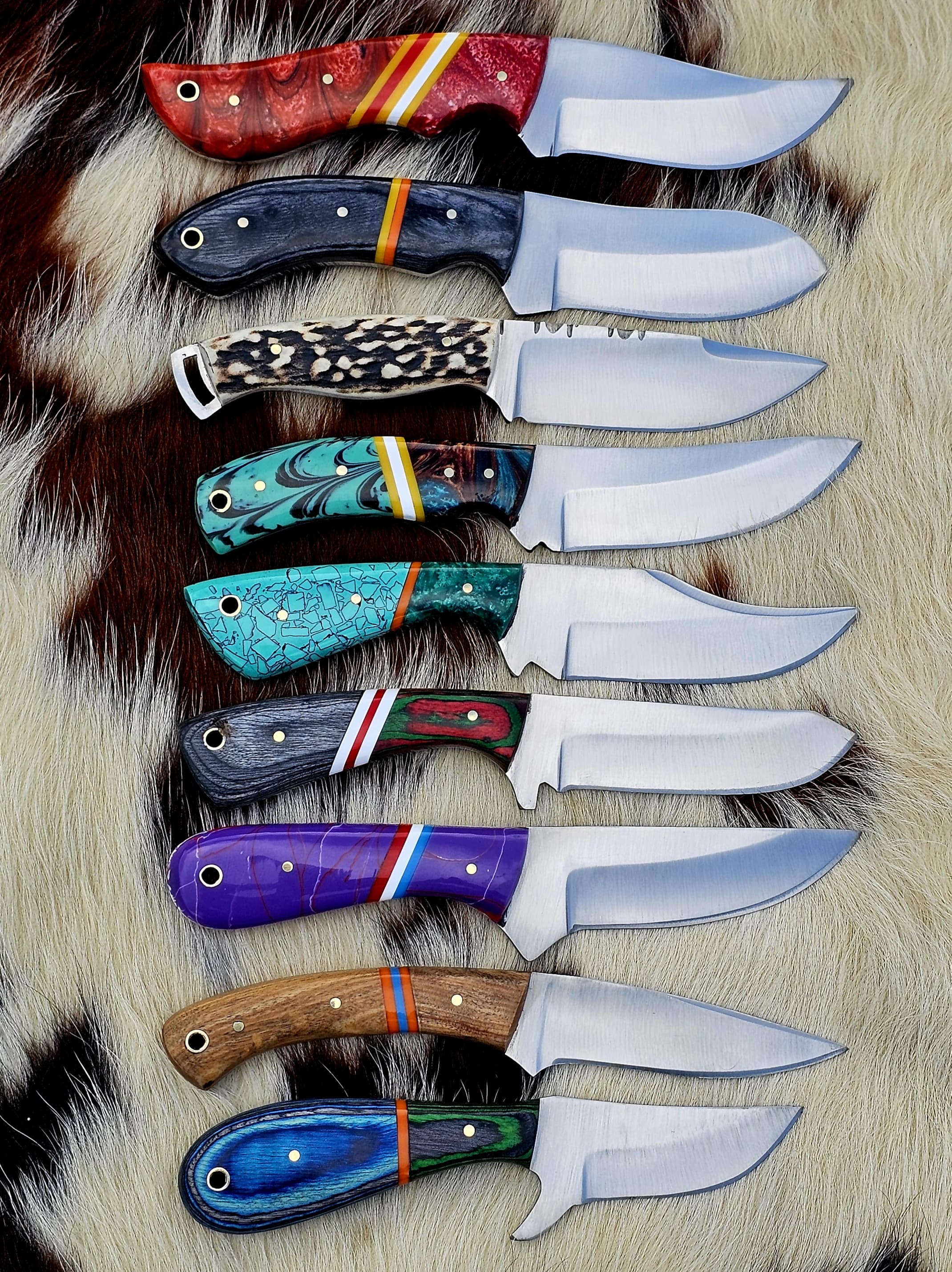 Handmade D2 Steel Fixed Blades 9 knives set overall length 8″inch Handle made of Rose wood and stage Horn with Resin Hold edges and comfortable Handle Grip comes with Leather sheath.