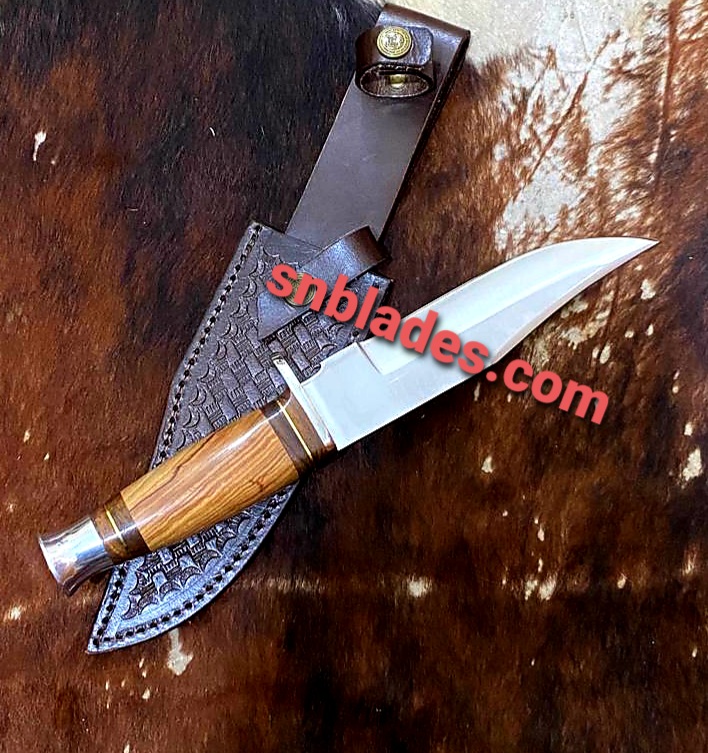 Handmade D2 steel Bowie Hunting knife overall length 12″inch Handle made of olive wood hold edge and comfortable Handle comes with leather sheath.