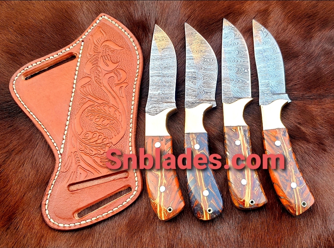 Handmade Damascus steel 4 Cowboy Skinner Knifes set Overall length 8″inch Handle made of pinecoon with brass booster hold edge and comfortable handle grip comes with 4 leather sheaths..
