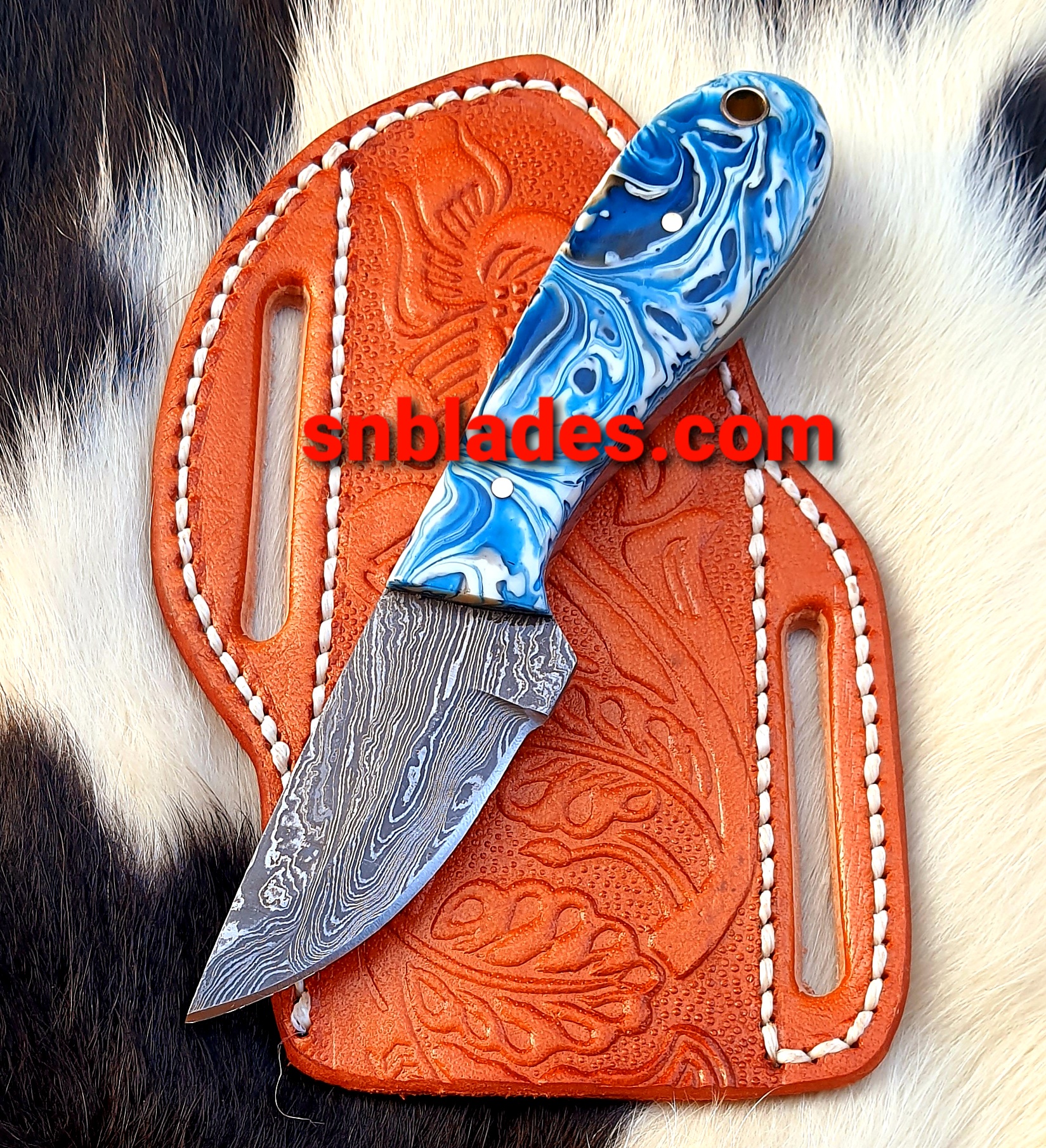 Handmade Damascus steel Cowboy Skinner knife overall length 6″inch handle made of Resin hold edge and comfortable handle comes with Leather sheath.