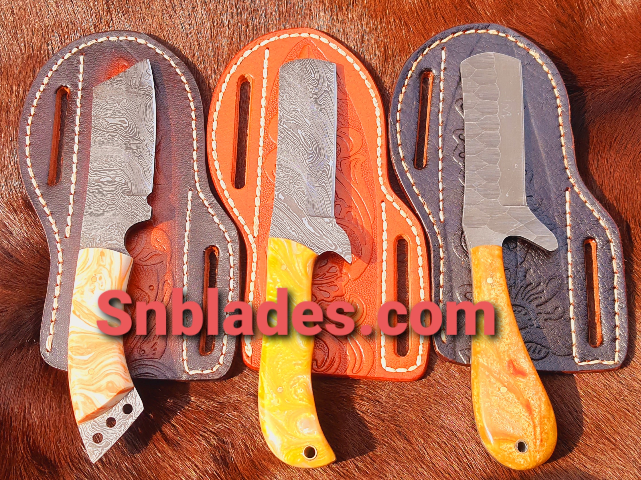 Handmade Damascus Steel Three Cowboy bull cutter and Skinner knives overall length 8″inch Handle made of Resin hold edges and comfortable Handle comes with Three leather sheaths..