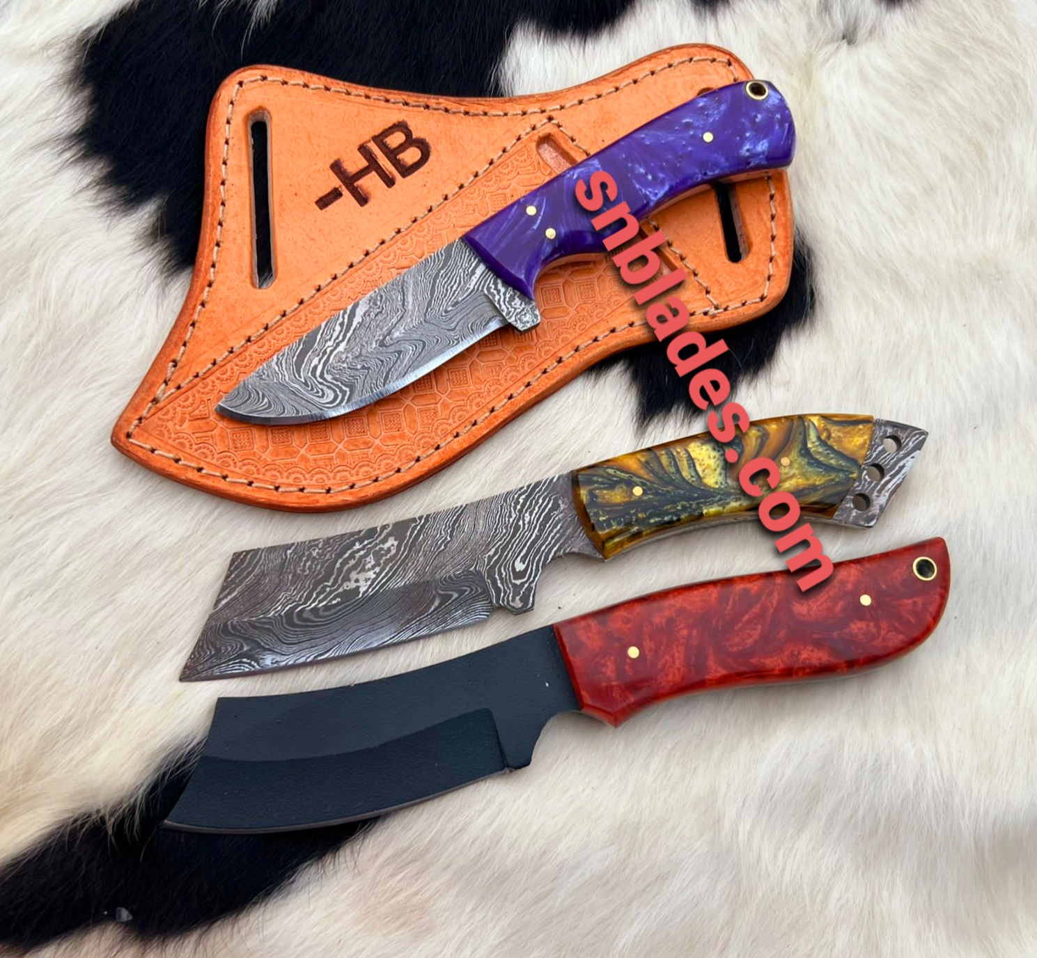 Handmade Damascus steel Three Hunting knives set overall length 8″inch Handle made of Rasin hold edge and comfortable Handle comes with Three leather sheaths.