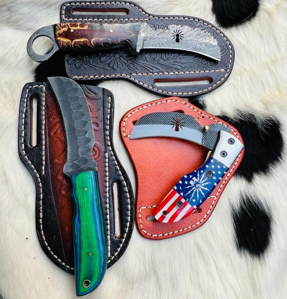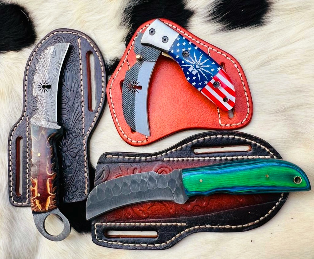 Custom Made 1095 Steel & Damascus Steel Three Hawkbill Lineman Skinner & Folding knives set …