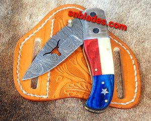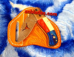 Handmade Damascus steel folding knife overall length 8″inch handle made of Taxes flage hold edge and Comfortable handle comes with leather sheath.