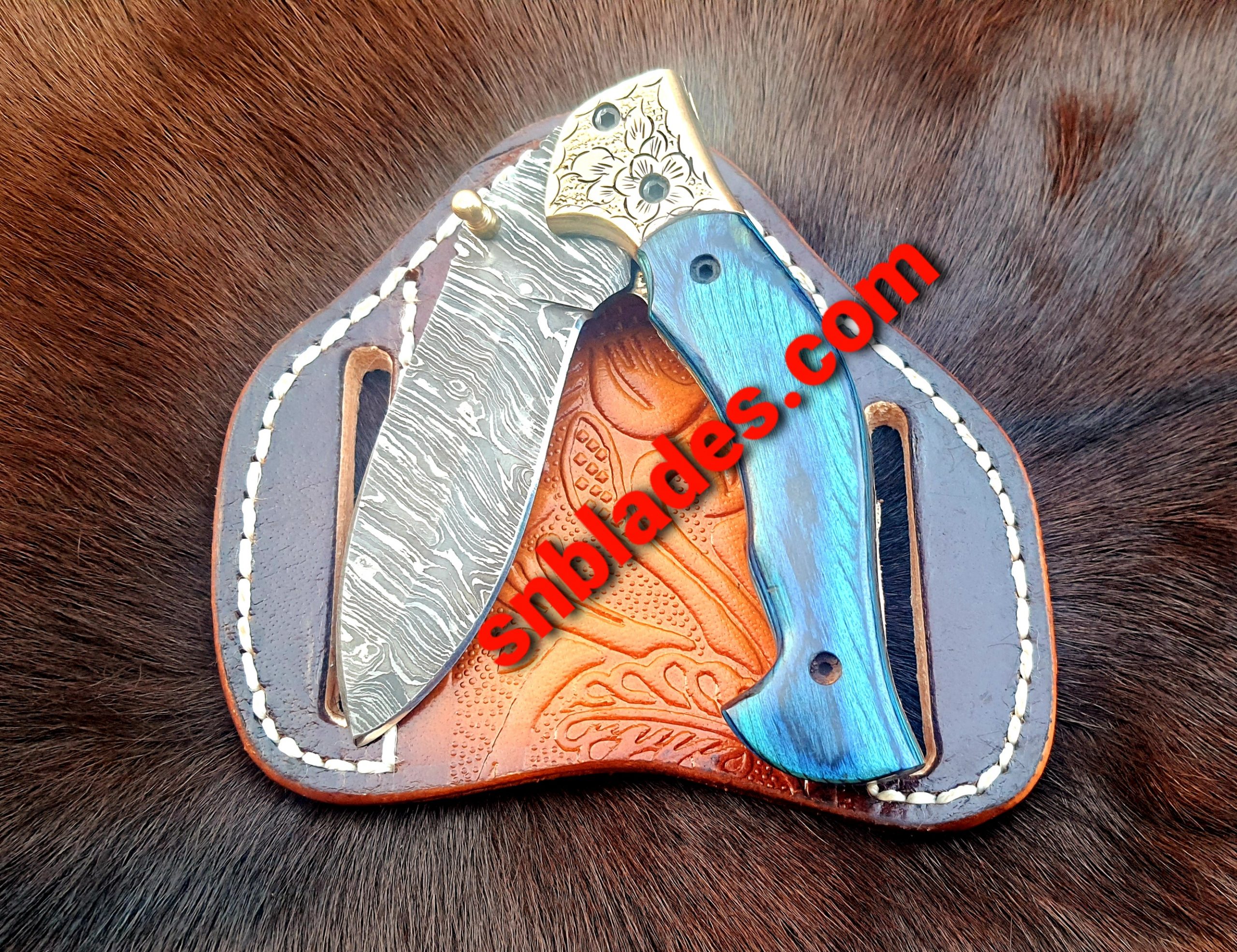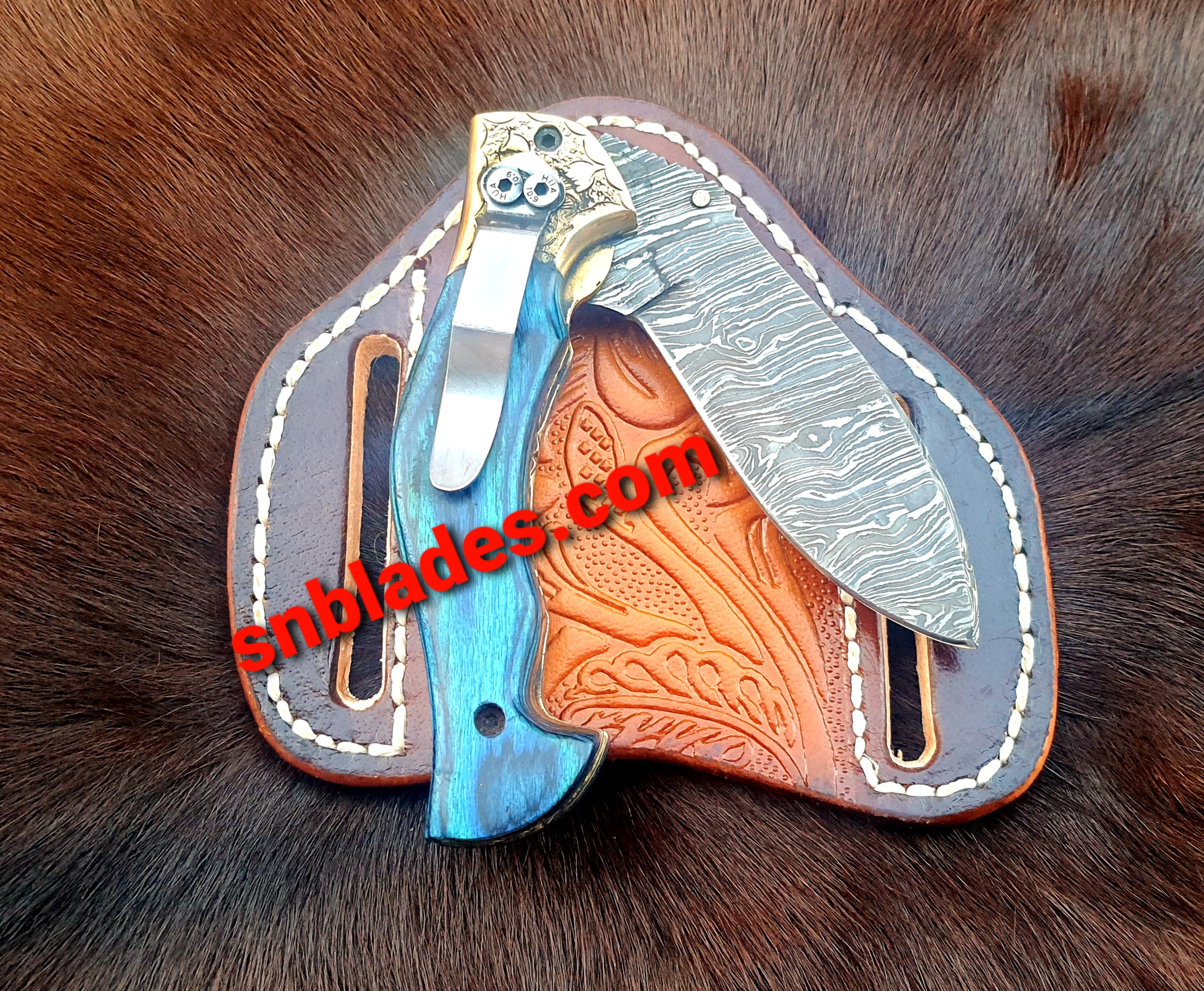 Handmade Damascus steel cowboy folding knife overall length 8″inch handle made of dollar wood hold edge and comfortable handle comes with leather sheath..