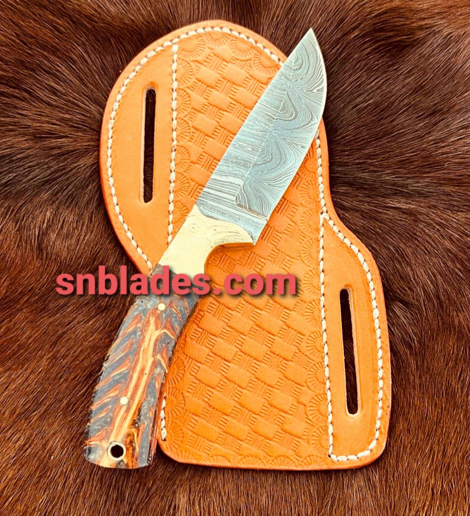 Handmade Damascus steel cowboy skinner knife overall length 8″inch Handle made of pine coon hold edge and comfortable Handle comes with leather sheath.