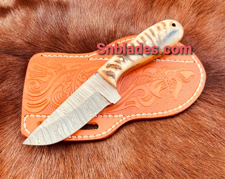 Handmade Damascus steel Cowboy Skinner knife overall length 8″inch Handle made of Ram Horn hold edge and comfortable handle comes with leather sheath..