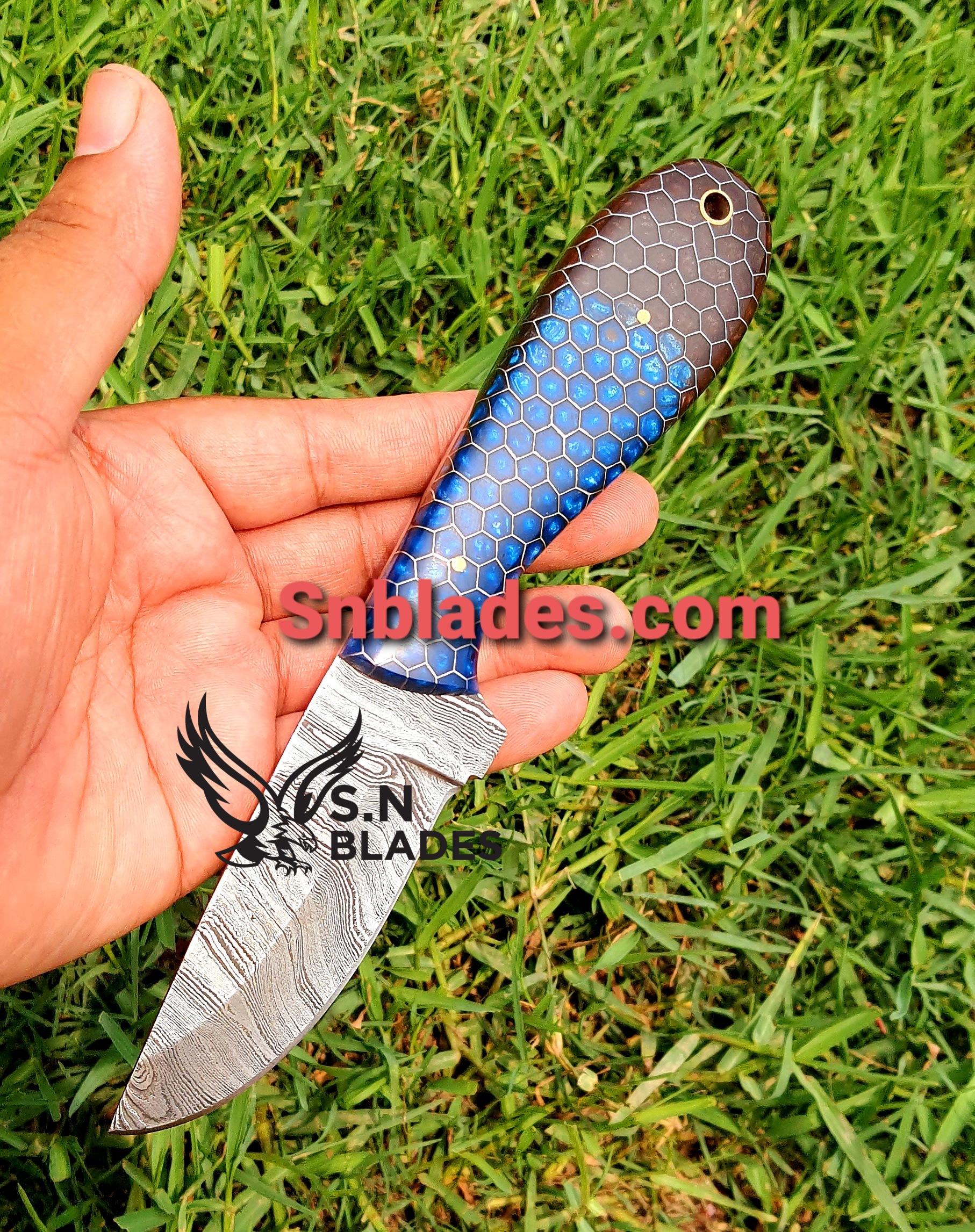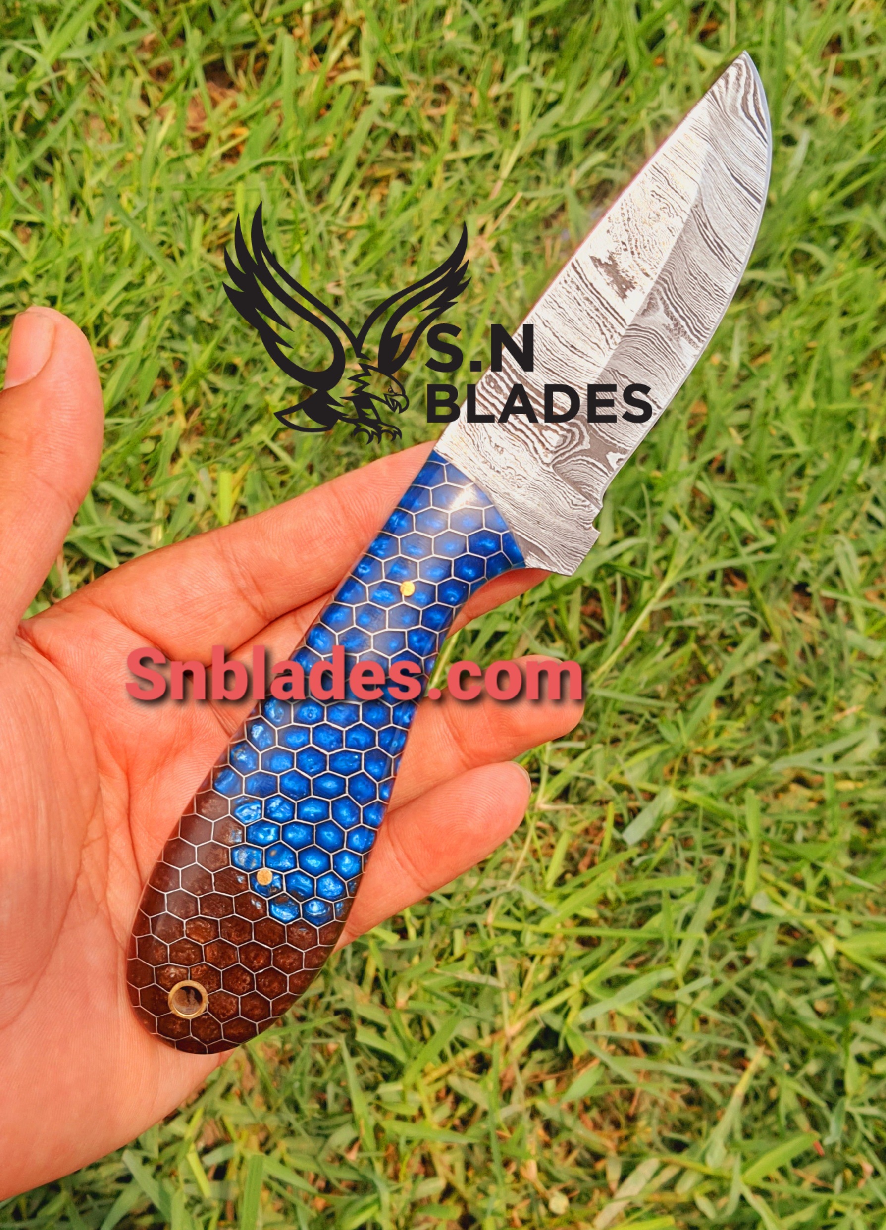 Handmade Damascus Steel Cowboy Skinner Knife overall length 8″inch handle made of sanke Resin hold edge and comfortable handle comes with leather sheath..