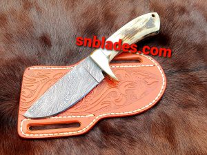 Handmade Damascus steel cowboy skinner knife overall length 8″inch handle made of stage horn hold edge and Comfortable handle comes with leather sheath.