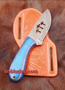 Handmade Damascus Steel Cowboy skinner knife overall length 8″inch handle made of dollar wood hold edge and comfortable handle comes with leather sheath..