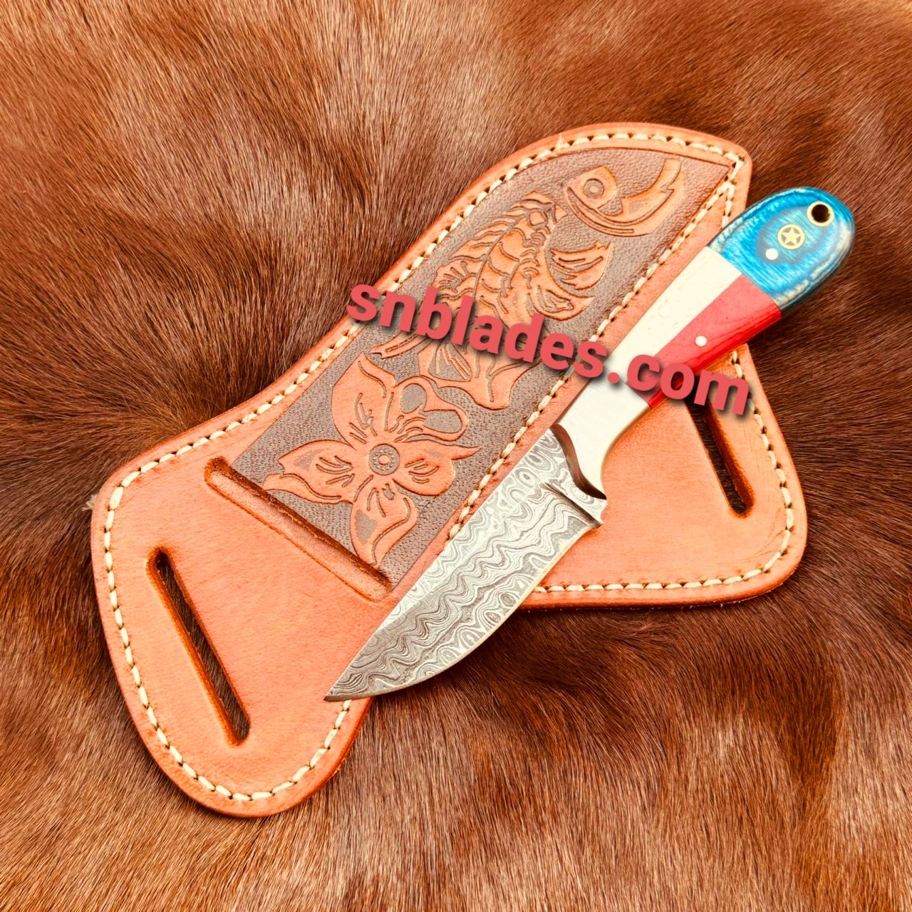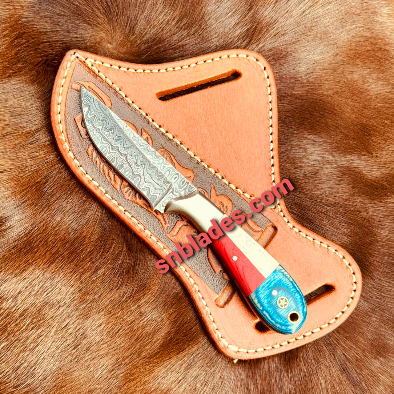 Handmade Damascus Steel cowboy skinner knife overall Length 7″inch Handle Made of Texas flag 🇨🇱 Handle Shrap edge and comfortable Handle Grip comes with leather sheath.