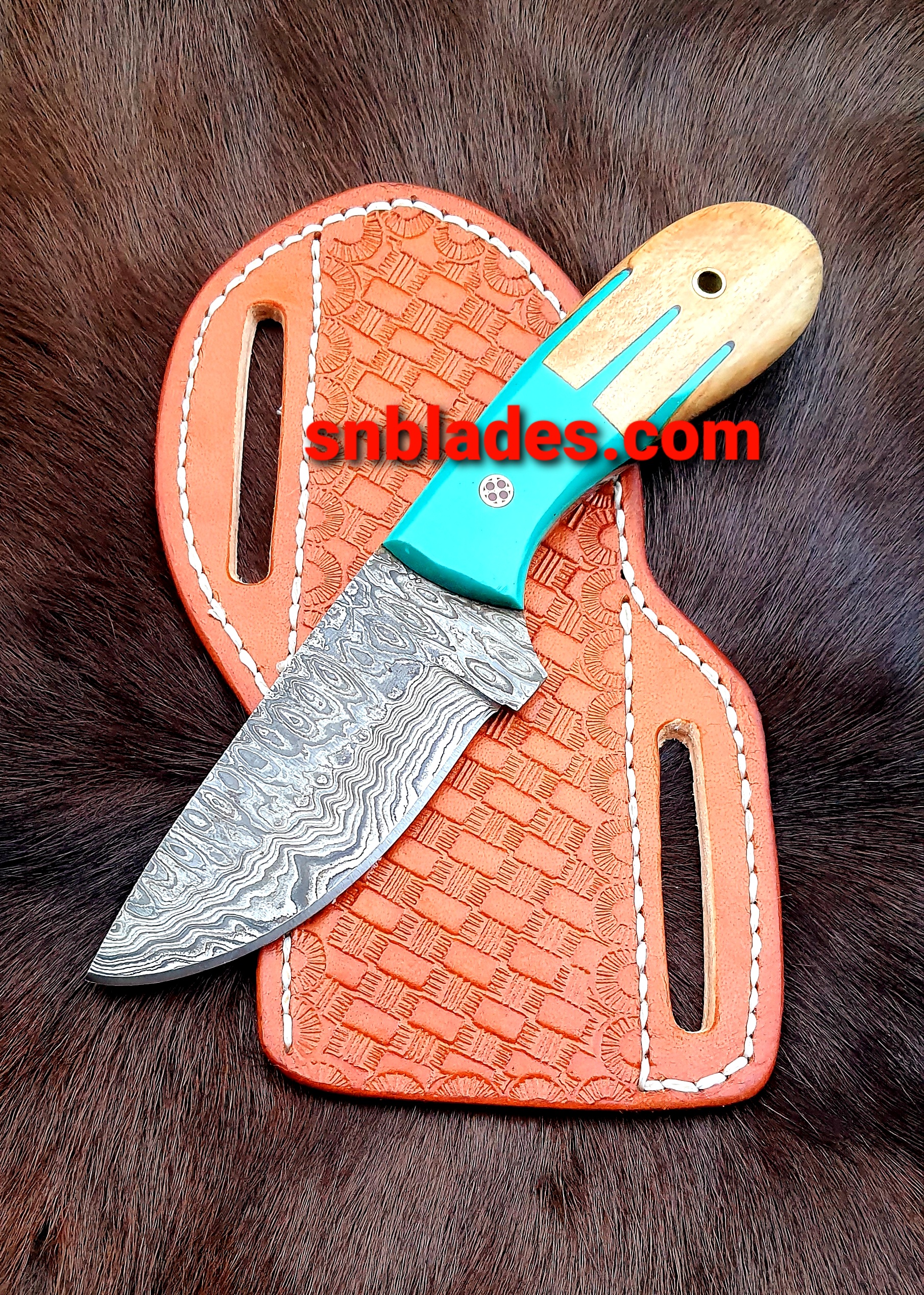 Handmade Damascus steel cowboy skinner knife overall length 8″inch handle made of Resin and wood hold edge and comfortable handle comes with cross darw leather sheath.