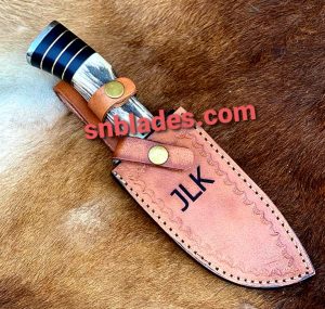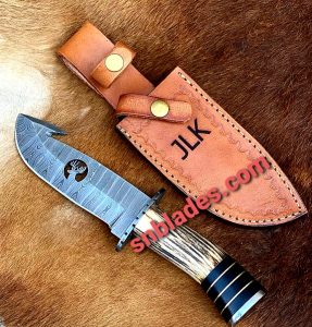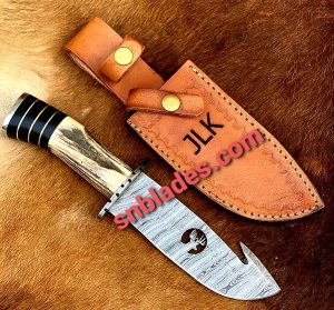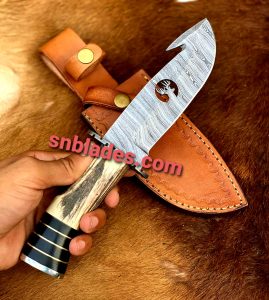 Handmade Damascus steel Deer Hunting gut hook skinner knife overall length 10 inches Handle made of stage horn and buffalo horn hold edge and comfortable handle comes with leather sheath.