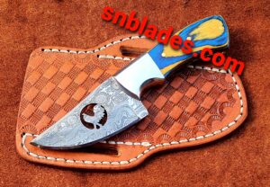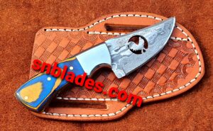 Handmade Damascus steel GameRooster skinner knife overall length 6″inch handle made of colour wood and steel bolster shrap edge and still long time comes with Leather Sheath..