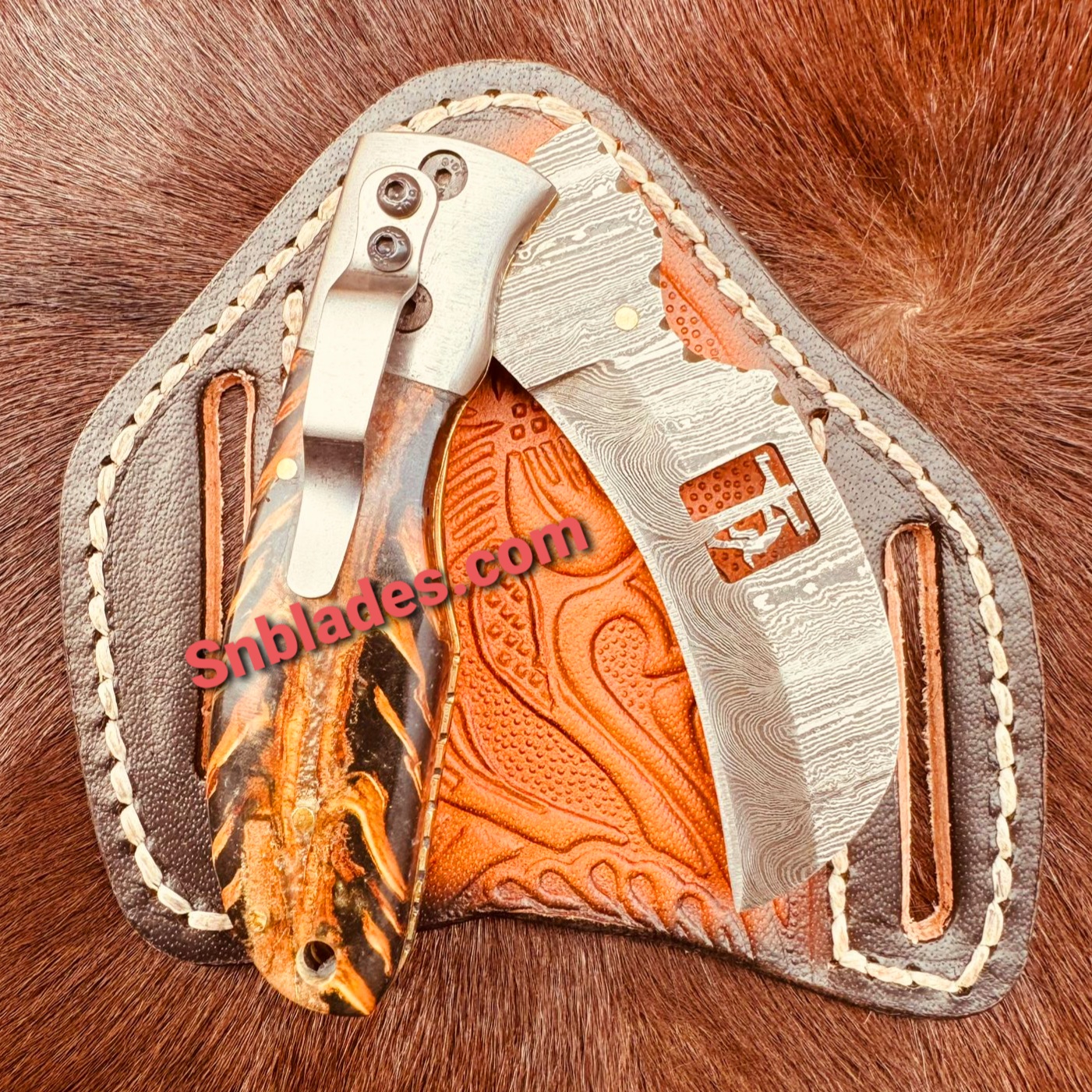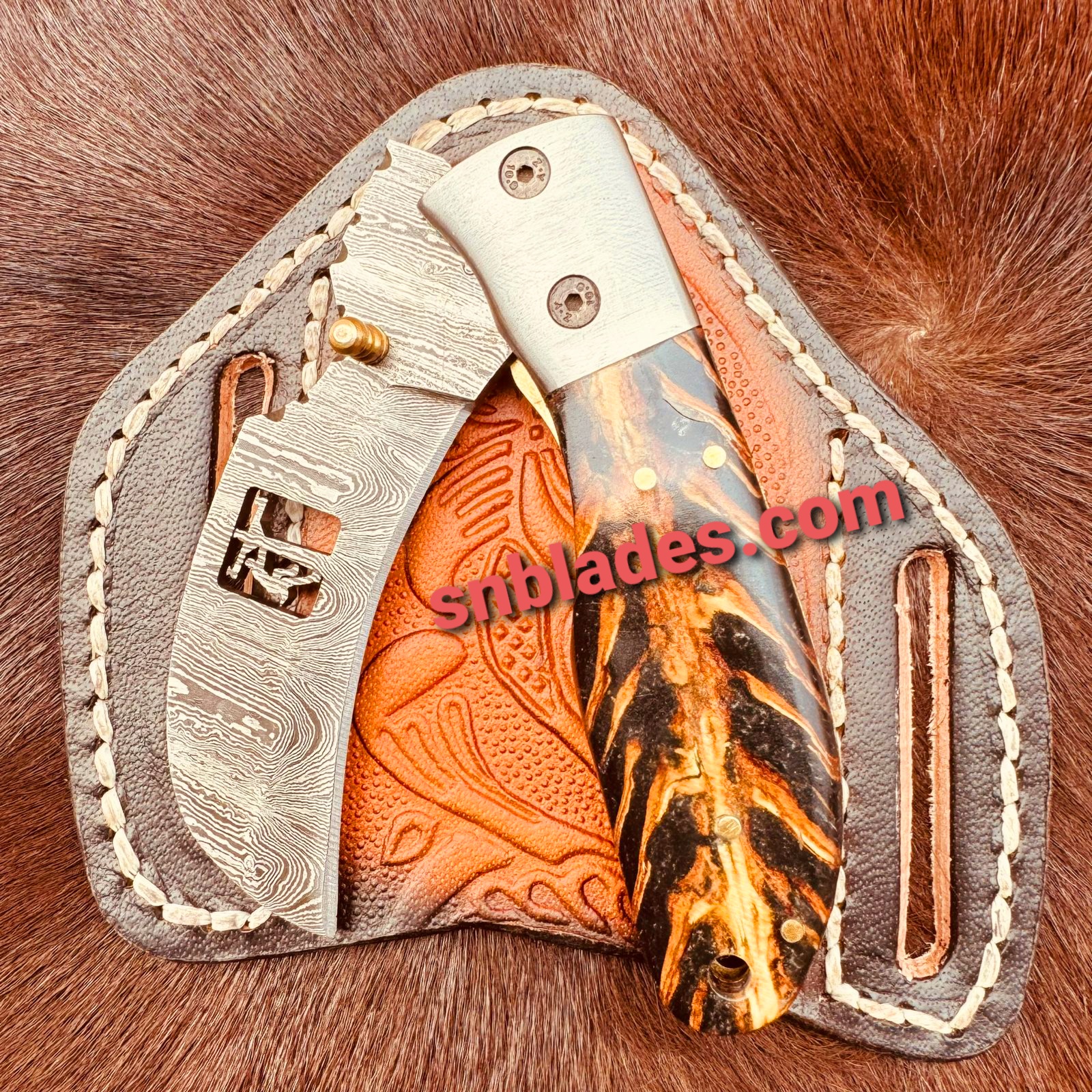 Handmade Damascus Steel Hawkbill Folding knife overall length 8″inch handle made of black pinecone Hold edge and comfortable grip comes with leather Sheath.