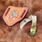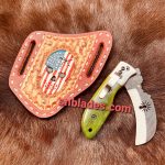 Handmade Damascus steel Hawkbill linemen Folding knife overall length 8″inch Handle made of color bone hold edge and comfortable handle comes with leather sheath as a picture.