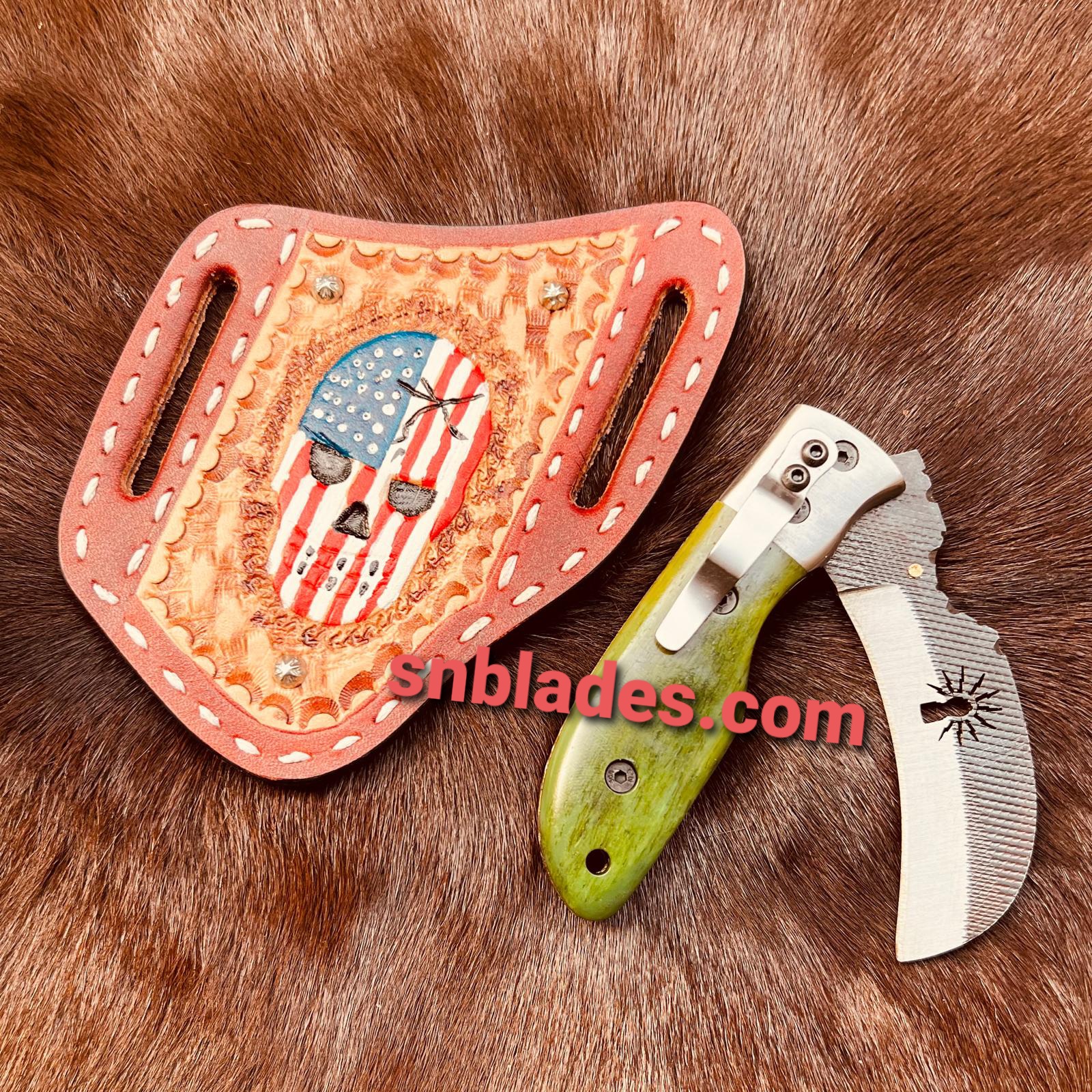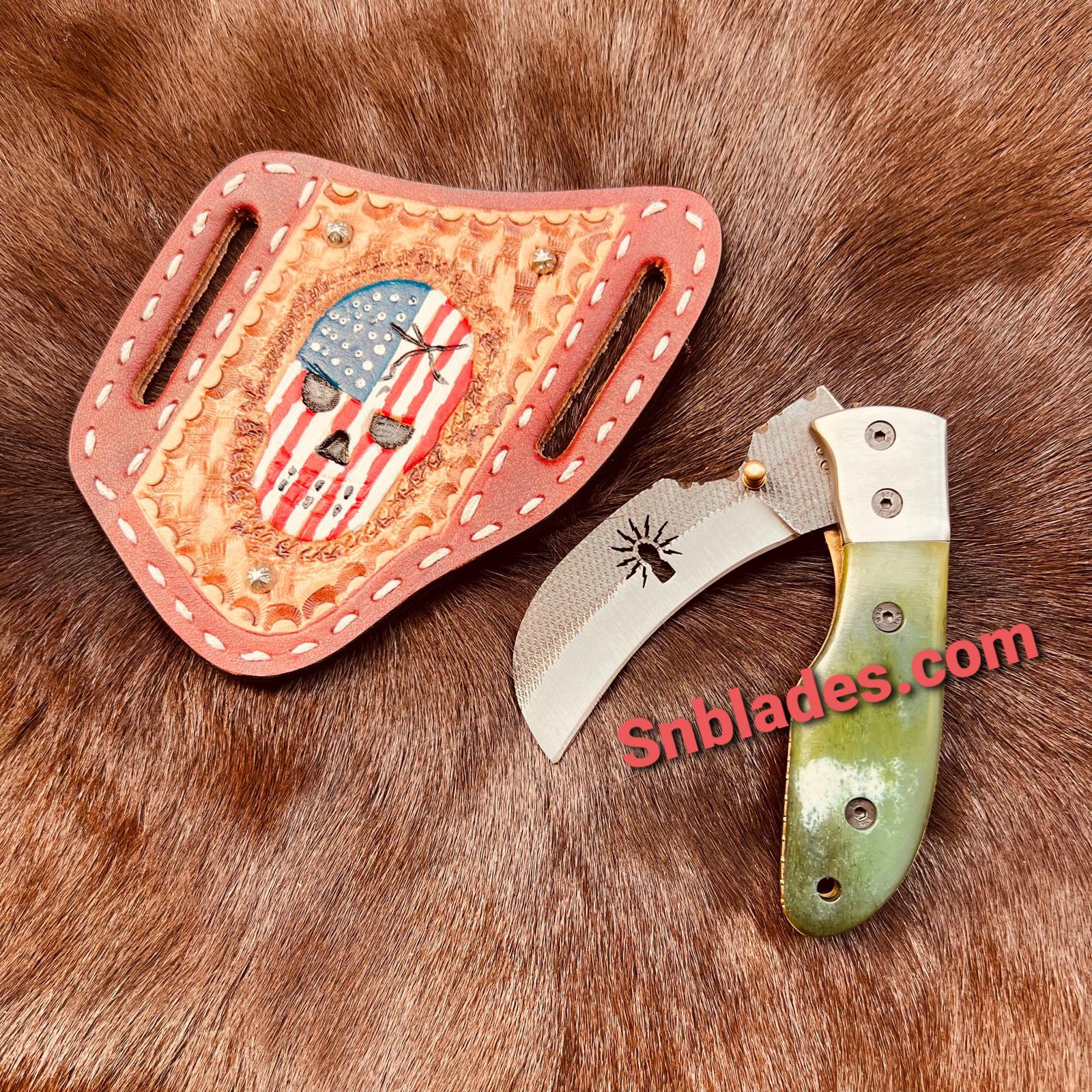 Handmade Hawkbill linemen Folding knife with leather sheath