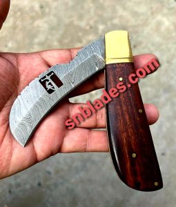 Handmade Damascus steel Hawksbill lineman Folding knife overall length 8″inch Handle made of burl wood hold edge and comfortable handle comes with leather sheath..