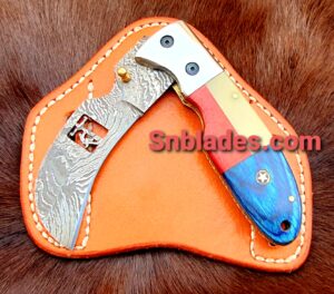 Handmade Damascus steel Hawksbill lineman Folding knife overall length 8″inch Handle made of Taxes Flag hold edge and comfortable handle comes with leather sheath..