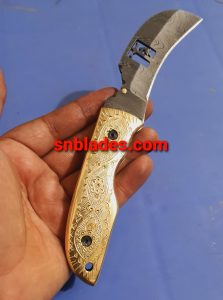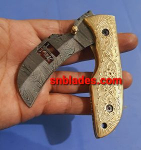 Handmade Damascus steel Hawksbill lineman folding knife overall length 8″inch handle made of brass with engraving handmade hold edge and comfortable handle comes with leather sheath..