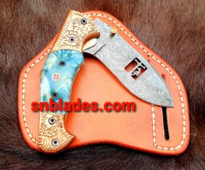 Handmade Damascus steel Hawksbill Lineman Folding knife overall length 8″inch handle made of Resin hold edge and comfortable handle comes with Leather sheath..
