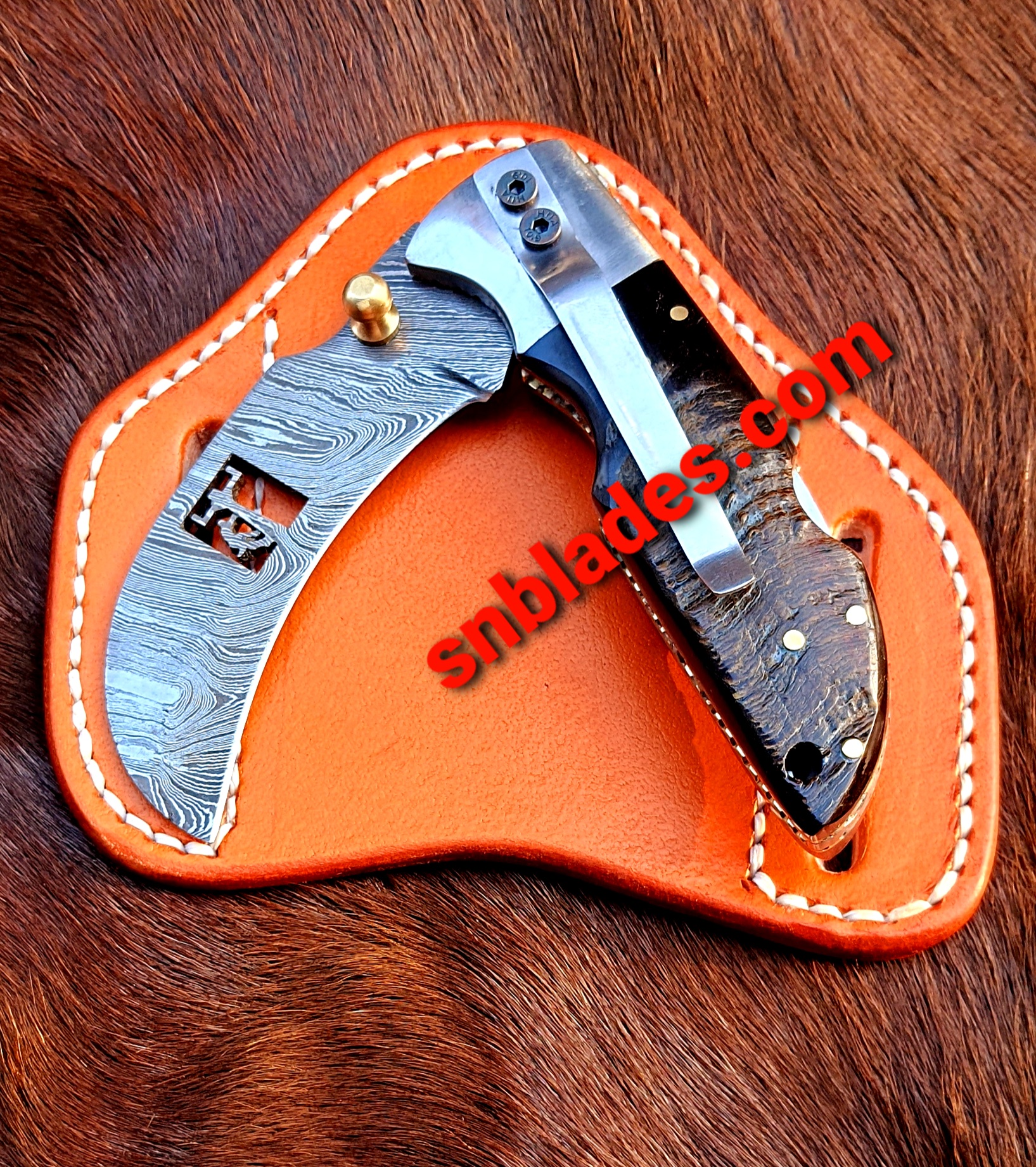 Handmade Damascus steel Hawksbill Lineman Folding knife overall length 8″inch handle made of Black Ram Horn hold edge and comfortable handle comes with Leather sheath.