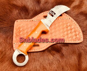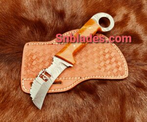 Handmade Damascus steel Hawksbill lineman Skinner knife overall length 8″inch Handle made of Resin hold edge and comfortable handle comes with leather sheath..