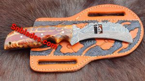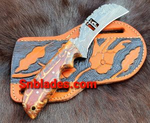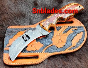 Handmade Damascus steel Hawksbill lineman skinner knife overall length 8″inch handle made of pinecone holds the edge and comfortable handle full tang blade comes with beautiful hand craft leather sheath..