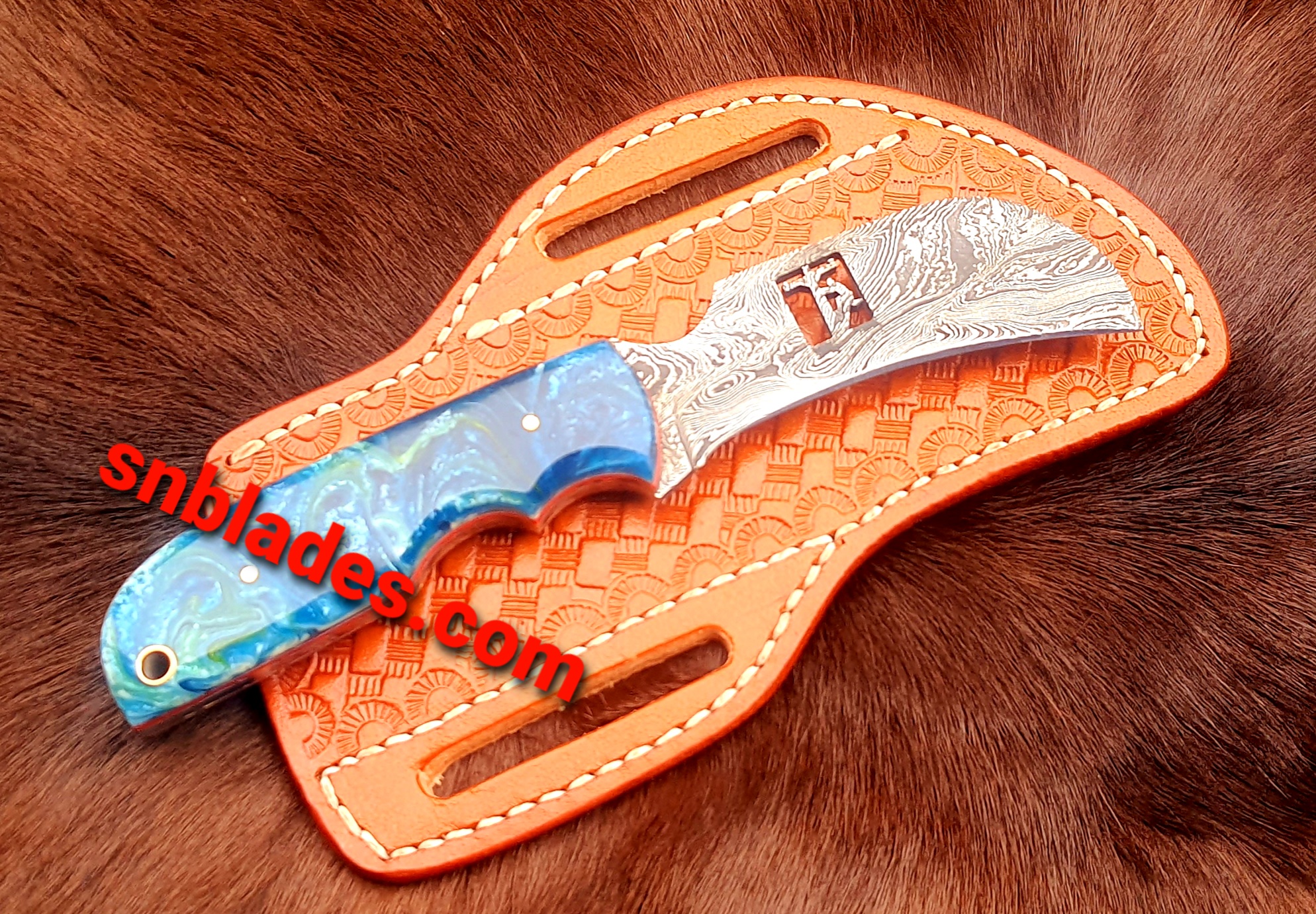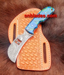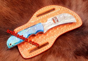 Handmade Damascus steel Hawksbill lineman skinner knife overall length 8″inch handle made of Resin hold edge and comfortable Handle comes with Cross darw leather sheath.