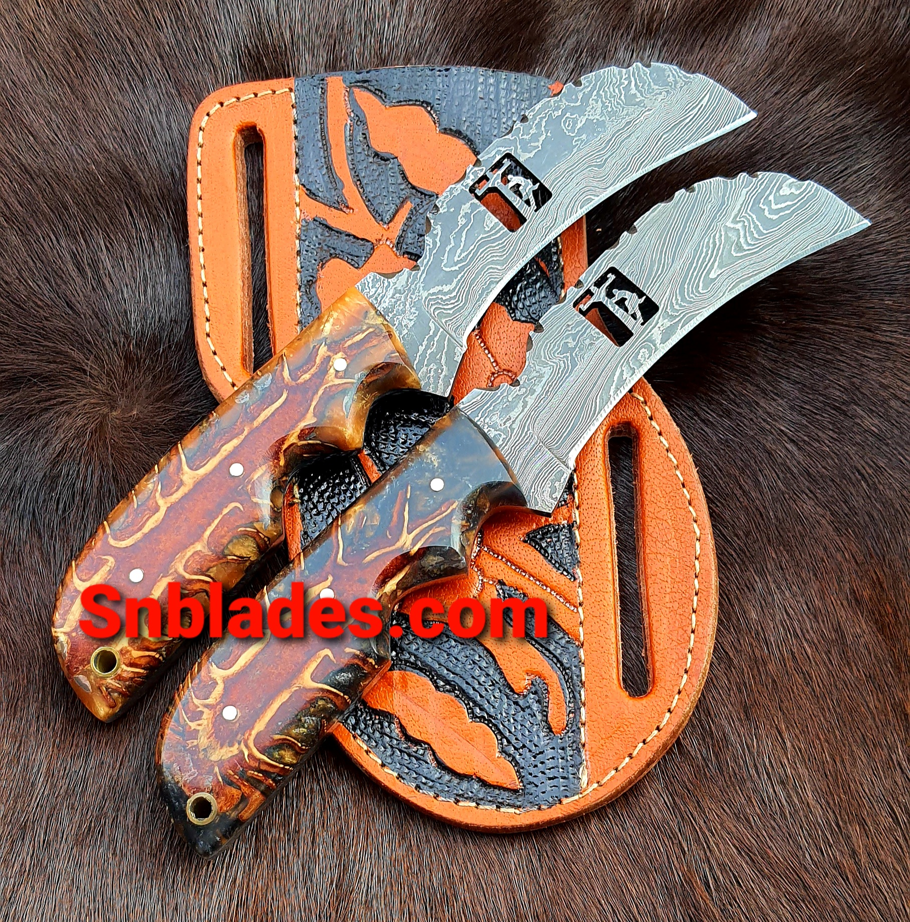 Handmade Damascus steel Hawksbill lineman two skinner knifes set overall length 8″inch handle made of pinecone holds the edge and comfortable handle comes with leather sheaths..