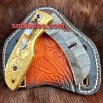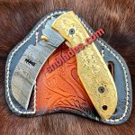 Handmade Damascus steel Hawksbill linemen Folding knife overall length 8″inch handle made of brass hold edge and comfortable handle comes with leather sheath..